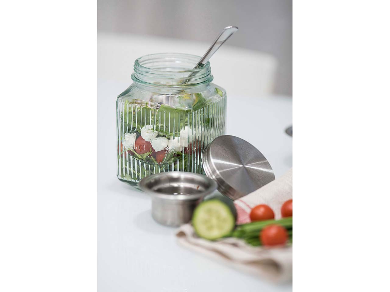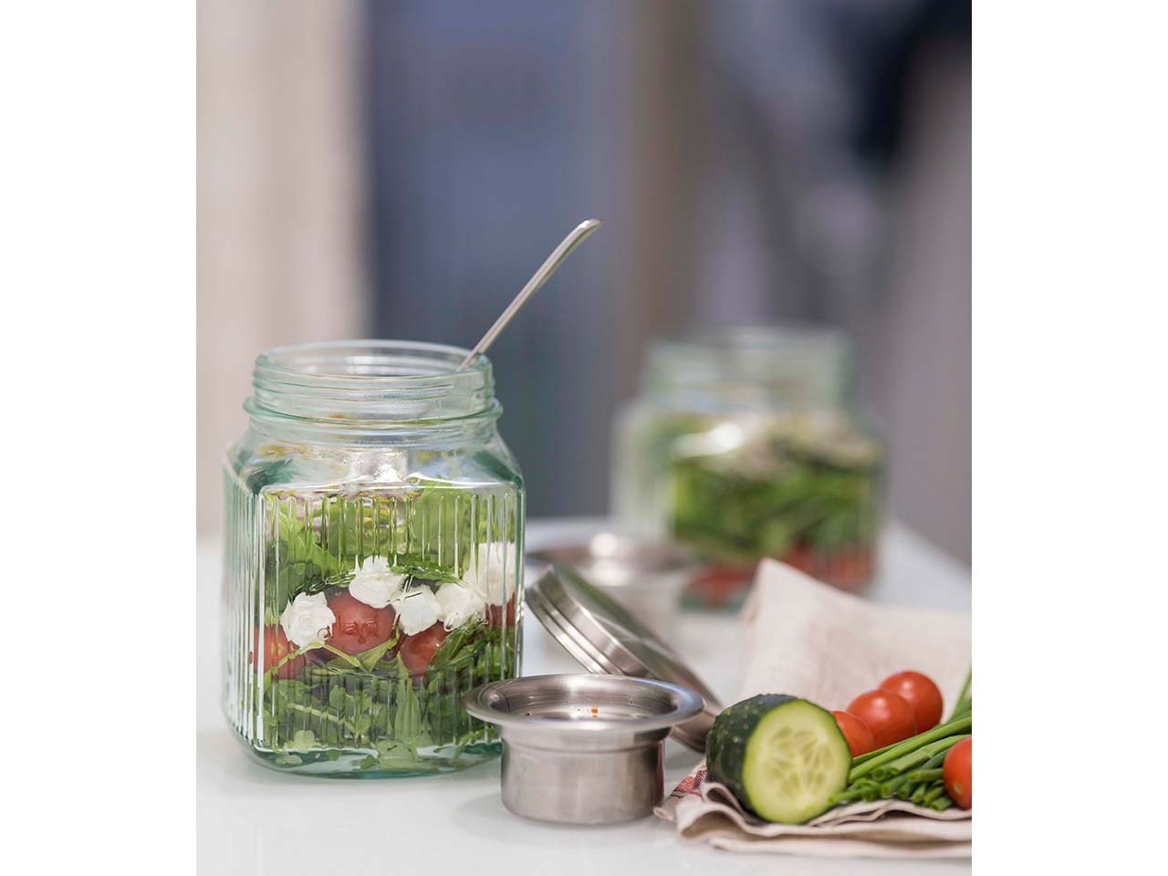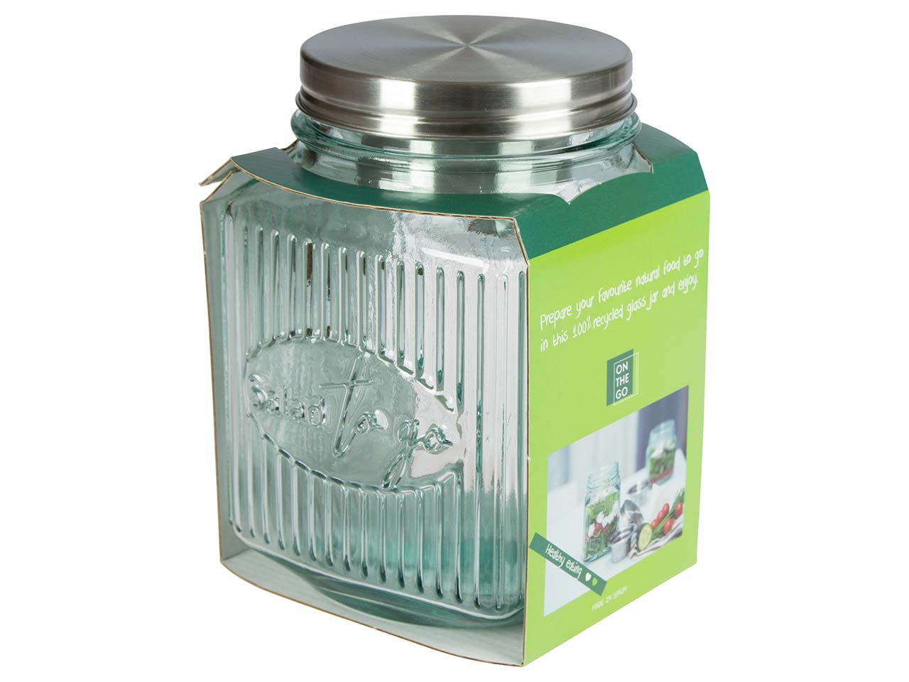 Genießen Sie Ihren Salat immer und überall mit dem praktischen Recycling-Schraubglas "Salad to go". Das langlebige, minimalistisch designte Glas mit Retrocharme verfügt im Schraubdeckel über einen Einsatz aus Edelstahl, in dem Sie Dressing oder Joghurt separat transportieren können. So bleibt Ihr Salat im Glas knackig und frisch! Schrauben Sie den Deckel ab, gießen Sie die Sauce über den Salat und schon können Sie auf der Arbeit, in der Schule oder unterwegs genießen. Erhältlich mit 0,8 oder 1,25 l Fassungsvermögen.