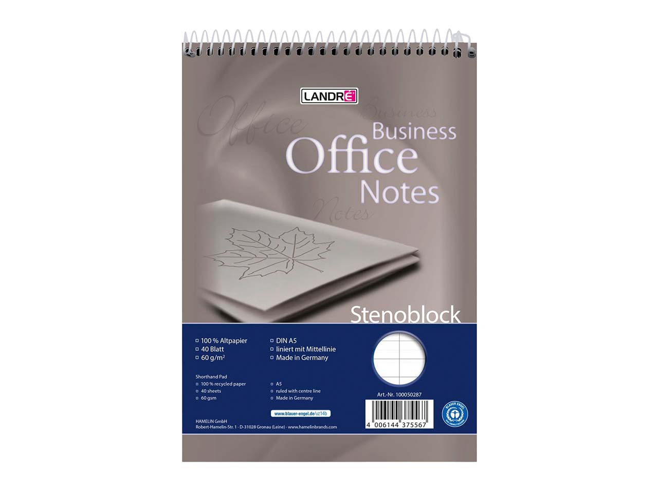 Stenoblock mit Kopfspirale im Format DIN A5. Der Block wird in Deutschland hergestellt und besteht aus Recyclingpapier. Ausgezeichnet mit dem Blauen Engel. Der Stenoblock ist liniert und verfügt über eine praktische Mittellinie. Ohne Randlinien. Weißegrad 60 % nach ISO. 40 Blatt, Format DIN A5, Grammatur 60 g/m².