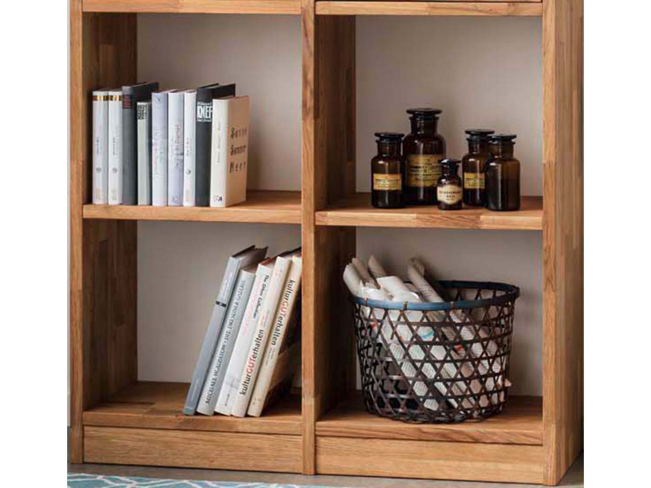 Das Regal wird aus massiver, FSC-zertifizierter Wildeiche gefertigt. Die Holzoberfläche ist Öl auf Pflanzenbasis geölt.