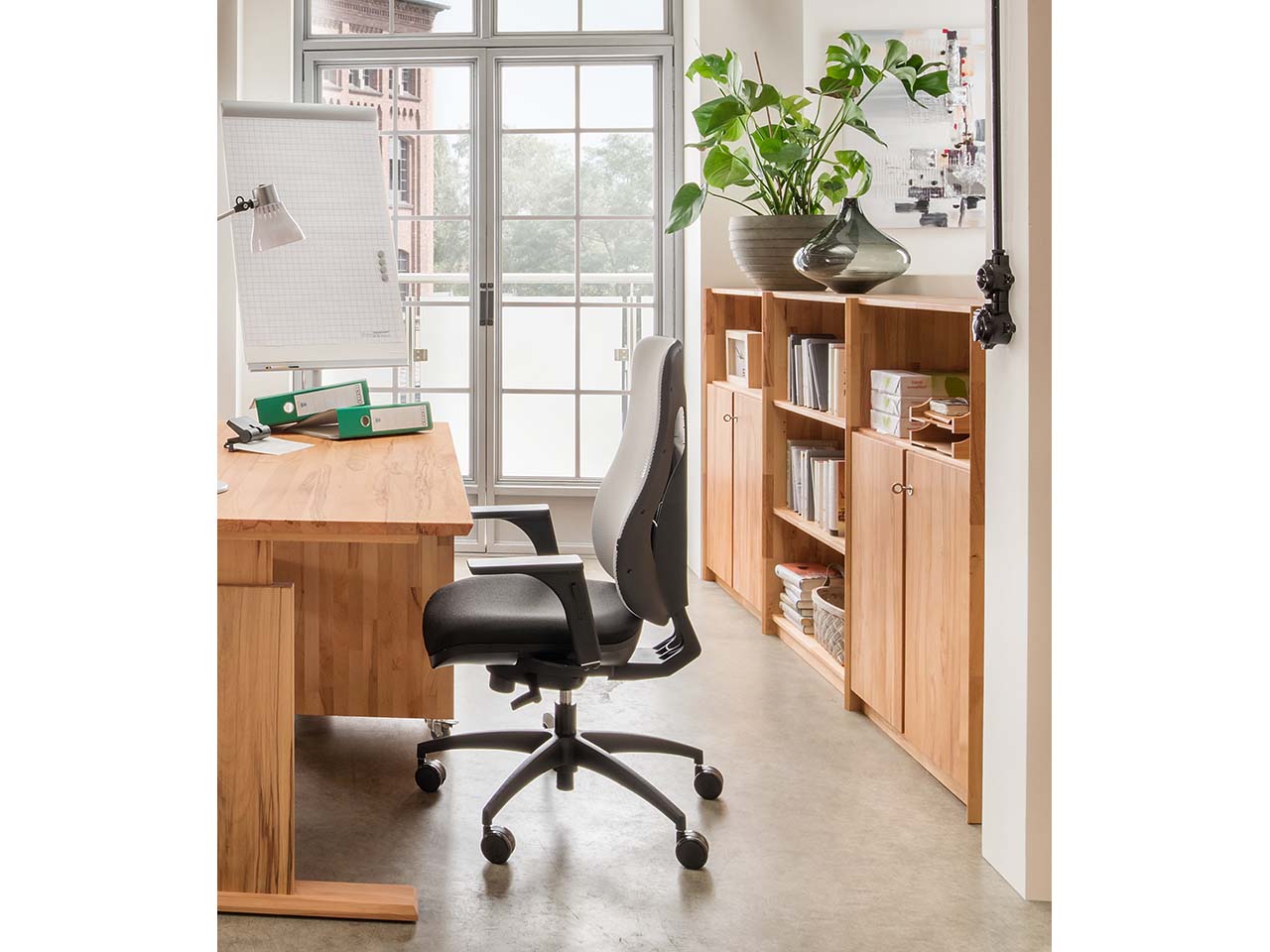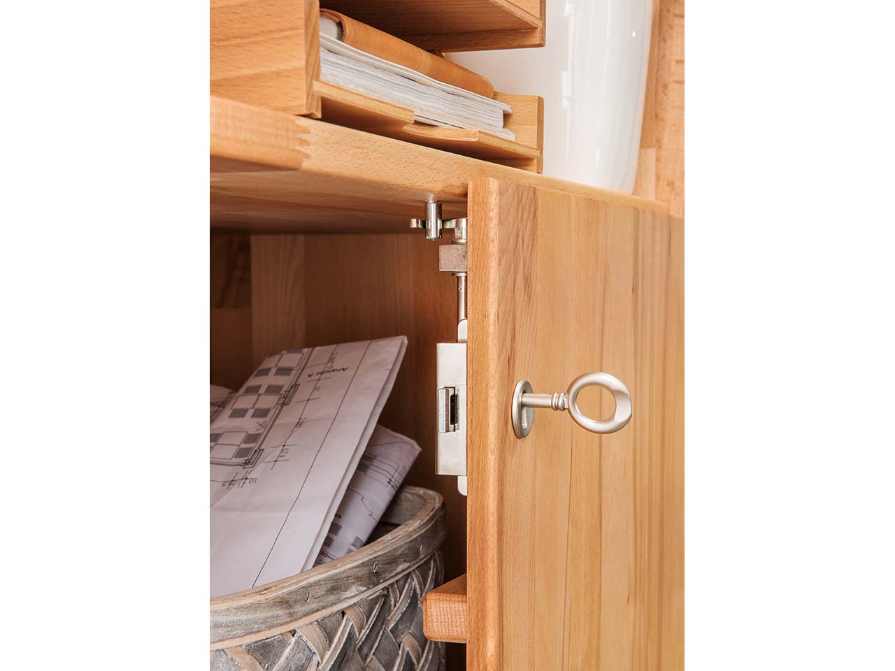 Aufgeräumte Optik für Büro und Homeoffice: Der abschließbare Regalschrank bietet viel Stauraum und ermöglicht die ordentliche Aufbewahrung von Akten, Ordnern und Co. Das Möbelstück ist mit einem offenen Fach versehen, in dem sich unter anderem Briefablagen, etc. unterbringen lassen. Das Fach eignet sich für alles, was schnell griffbereit sein soll. Kernstück sind die abschließbaren Türen. Sensible Dokumente sind so stets geschützt. Hergestellt ist der Regalschrank aus massiver, geölter Kernbuche, wodurch er sehr natürlich wirkt und eine langlebige, robuste Qualität erhält. B 80 x T 36 x H 114 cm.