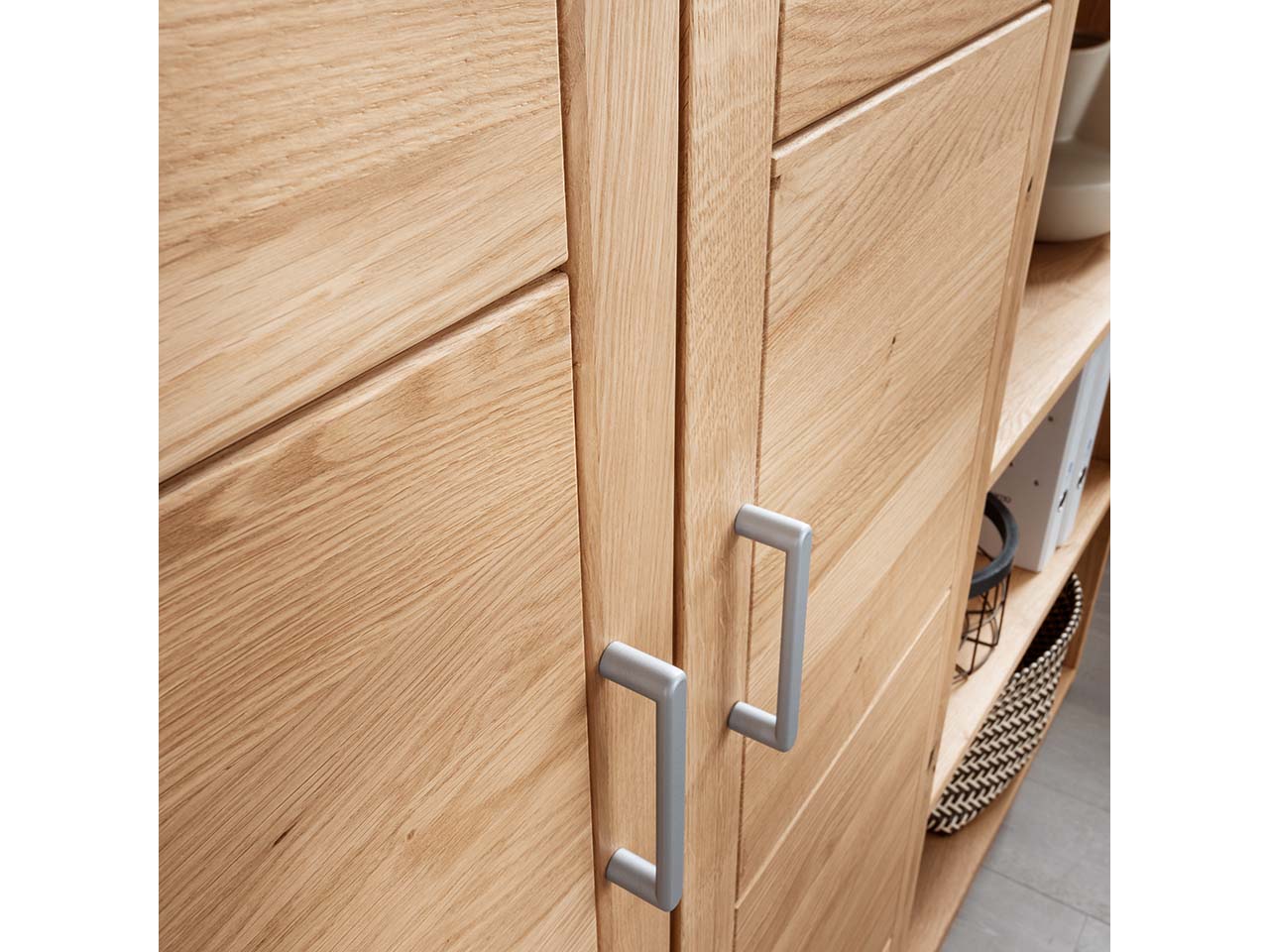 Dieser Regalschrank in modernem, zeitlosem Design ist exzellent verarbeitet und eine Bereicherung für Büro oder Arbeitszimmer. In dem offenen Fach lassen sich z.B. Bücher unterbringen, die griffbereit sein sollen. Hinter den zwei Türen mit optisch ansprechender Front und hochwertigen Metallgriffen befindet sich weiterer Stauraum. In diesen Fächern sind Ordner, Akten, etc. ordentlich untergebracht. Durch die Herstellung aus massiver, geölter Wildeiche entsteht eine langlebige, robuste Qualität. Das wirkt mit seiner ausdrucksstarken Maserung besonders natürlich. Im Lieferumfang sind schwarze und silberne Griffe enthalten, sodass eine Farbauswahl nach persönlichem Geschmack möglich ist. B 80 x T 33 x H 112 cm.