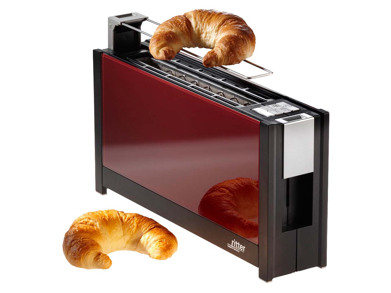 Frühstück ist serviert: Mit dem ritter Toaster bleiben bei Frühstück, Zwischenmahlzeit oder Abendbrot keine Wünsche offen. Es lassen sich zwei Scheiben Toast gleichzeitig toasten und dank der integrierten Brötchenauflage lassen sich auch Brötchen, Croissants, etc. aufbacken. Zudem ist der Langschlitztoaster sehr schmal, sodass er sich perfekt in große und kleine Küchen integriert.