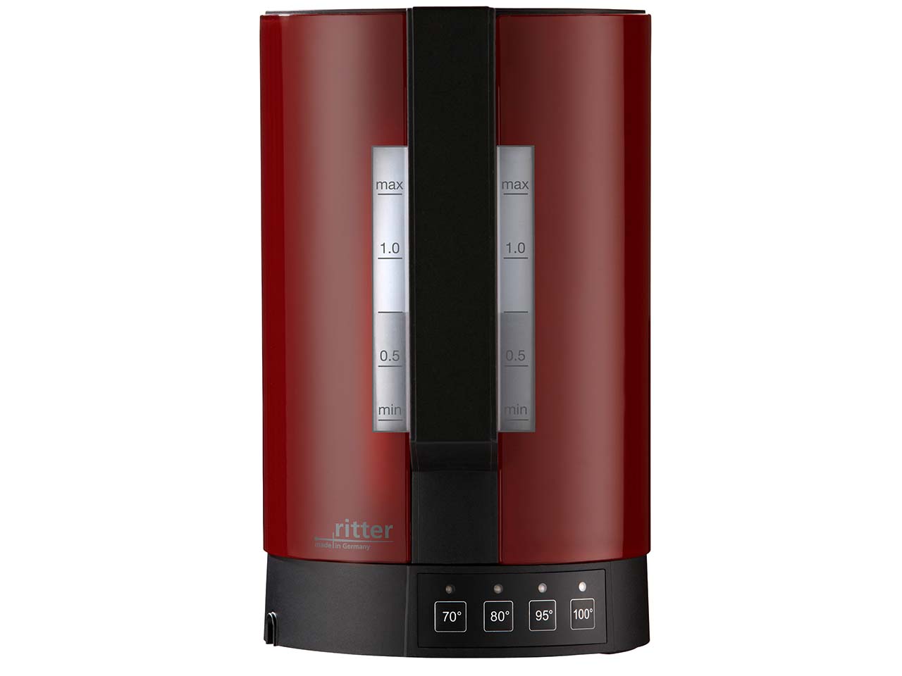 Der in Deutschland gefertigte ritter Wasserkocher "fontana 5" verfügt über eine 360°-Basisstation und überzeugt mit einem wärmeisolierten Außengehäuse aus Acrylglas. Die Temperatureinstellungen zwischen 70° und 100° C sind LED-beleuchtet und durch das beidseitige Sichtfenster lässt sich der Wasserstand einfach ablesen. 1,1 l Fassungsvermögen.