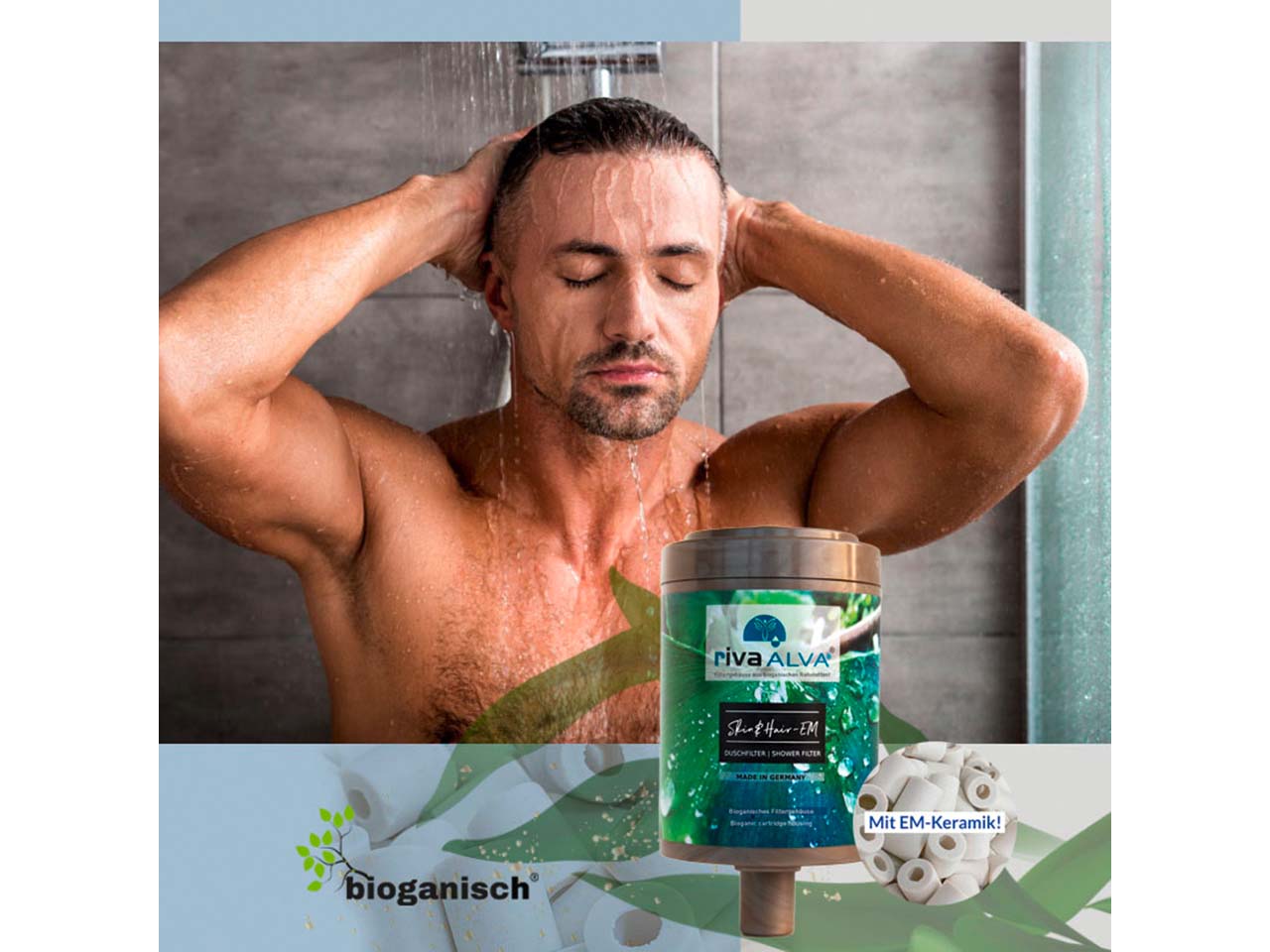 Die richtige Haut-und Haarpflege beginnt bereits mit dem Wasser! Dieser Duschfilter von riva mit EM-Keramik (EM = effektive Mikroorganismen) und hochwirksamer Blockaktivkohle für naturnahes Wasser schützt vor Leitungsverunreinigungen und Schadstoffen. Dank dieser Filterung kann ein gesünderes Hautbild entstehen, die Kopfhaut entspannt sich und die Haare wirken freier und schöner. Wie auch die anderen riva Filter besteht die Halterung aus einem robusten, edlen Gehäuse aus eloxiertem und lebensmittelechtem Aluminium. Mit diesem kommt das Wasser aber nicht in Berührung! Im Gegensatz zu anderen Wasserfiltern ist diese Kartusche nämlich so entwickelt, dass das Wasser nur durch die Kartusche selbst läuft und keinen Kontakt zum Alu-Innengehäuse hat. Die biogenische Kartusche ist frei von erdölbasierten Kunststoffen und besteht aus nachwachsenden, organischen Rohstoffen sowie Mineralien und biologischen Additiven wie Naturharzen und -wachsen. Gefiltert werden unter anderem Chlor und Chlornebenprodukte, Schwermetalle, Farbstoffe, Hormon- und Medikamentenrückstände, PFC, Asbest, Mikroplastik, Pestizide, Fungizide, Kalkpartikel, Bakterien, Keime sowie Geruchs- und geschmacksstörende Stoffe. Die Kartusche sollte ca. alle 6 Monate gewechselt werden - wobei dies auch von der Eingangswasserqualität und dem Hausleitungszustand abhängig ist.