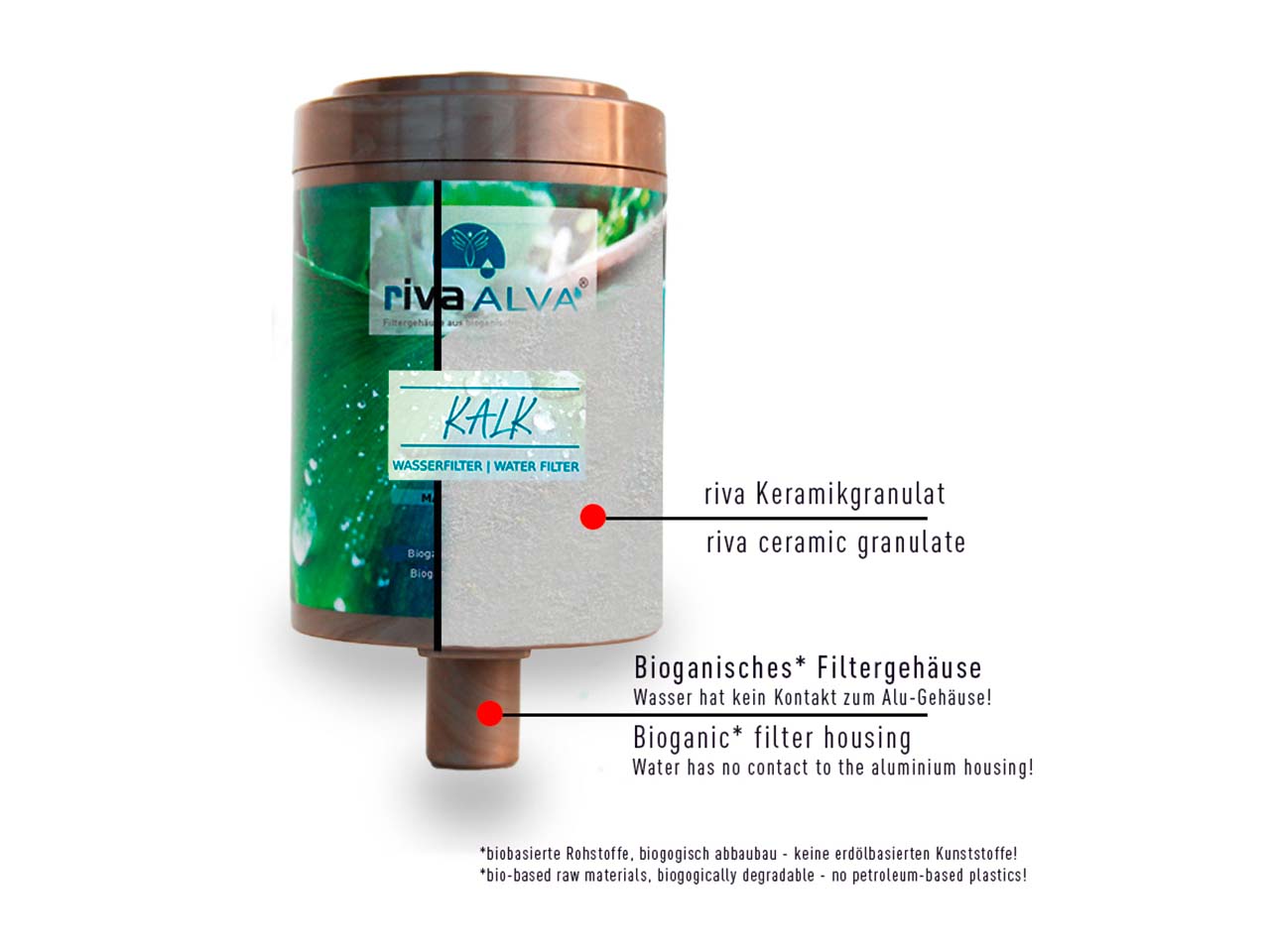 Anders als bei der Entkalkung mit Ionenaustauschharzen wird das Wasser durch diesen natürlichen Kalkfilter chemisch nicht verändert und die Trinkwasserqualität bleibt inklusive Magnesium und Kalzium erhalten. Was der Kalkfilter nicht leisten kann: Schadstoffe aus dem Wasser filtern. Das ist aber kein Problem! Dank cleverem Baukastenprinzip lässt sich der Kalkfilter mit allen riva Trinkwasser- und Duschfiltern kombinieren: Die zwei Filtergehäuse werden einfach zusammengeschraubt. Dabei ist der Kalkfilter immer die 2. und letzte Filterstufe.