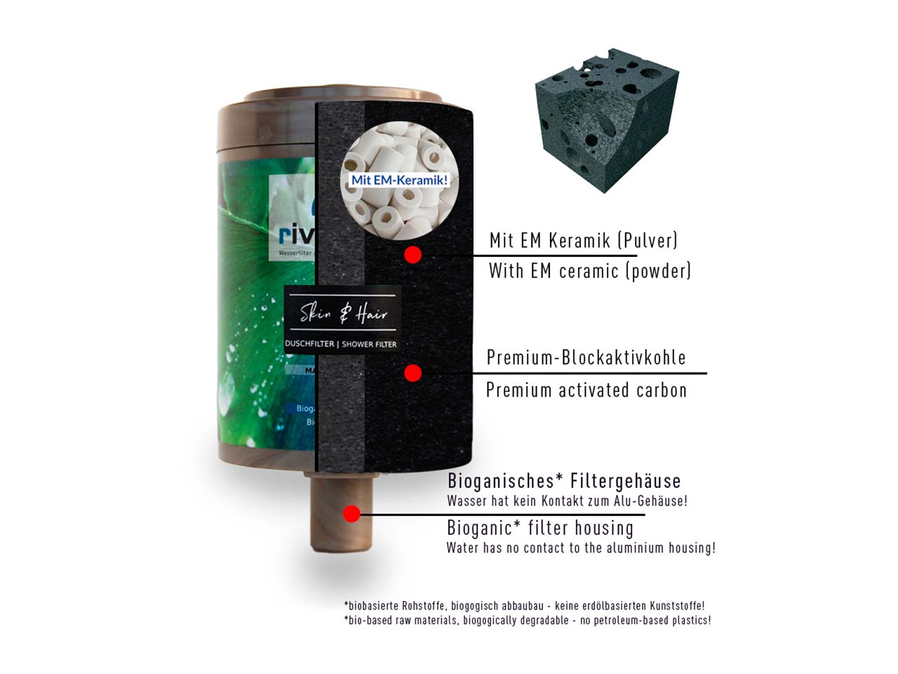 Der Wasserfilter wird in Deutschland hergestellt. Die Kartusche ist zertifiziert lebensmittelecht und bioganisch. Das bedeutet, dass sie aus nachwachsenden und organischen Rohstoffen, Mineralien sowie biologischen Additiven wie Naturharzen- und wachsen gefertigt ist. Anders als viele herkömmliche Filterkartuschen ist sie frei von erdölbasierten Kunststoffen, biobasiert und auch biologisch abbaubar. Der Filter sorgt für vitalisiertes, saubereres Wasser, das besser für Haut und Haar sein kann.