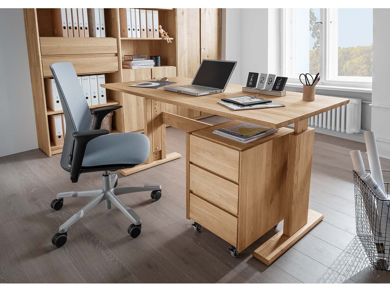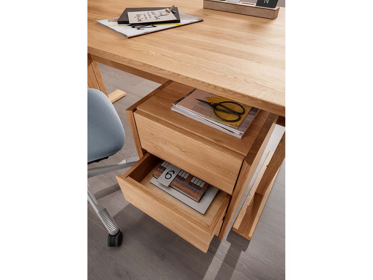 Dieser Rollcontainer sorgt in Büro und Homeoffice für mehr Ordnung. Drei Schubladen mit Griffmulden bieten viel Platz, um Dokumente, Schreibgeräte und weiteres Zubehör ordentlich zu verstauen und dennoch immer griffbereit zu haben. Hergestellt ist der Rollcontainer aus massiver, geölter Wildeiche. Das verleiht dem Möbelstück eine natürliche Optik. Das Holz sorgt gleichzeitig für eine robuste, langlebige Qualität. Die Rollen machen den Rollcontainer mobil, sodass er immer dort eingesetzt werden kann, wo er gebraucht wird. B 40 x T 50 x H 59,8 cm.