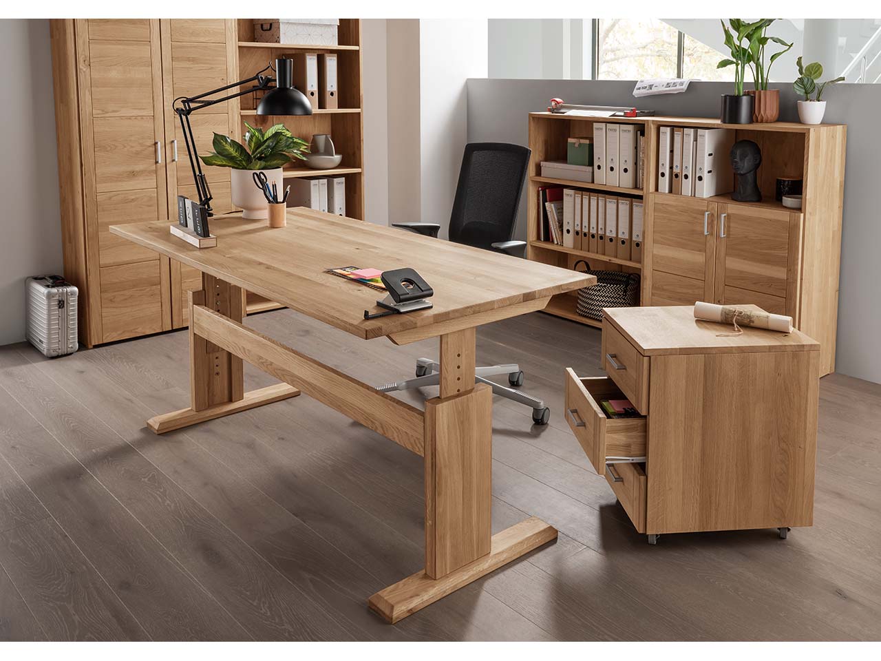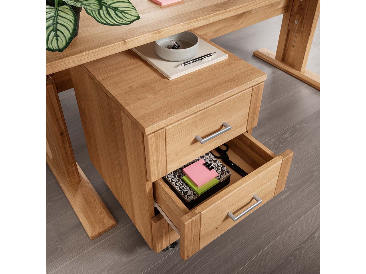 Einfach unentbehrlich im Büro oder Arbeitszimmer: Der Rollcontainer aus massiver, geölter Wildeiche sieht mit seiner ausdrucksvollen Maserung nicht nur gut aus, sondern ist vor allem praktisch. Drei Schubladen mit hochwertigen Griffen bieten viel Stauraum für Büro- und Schreibtischzubehör. Dank der Rollen lässt sich der Rollcontainer auch schnell bewegen, wenn er an einem anderen Ort gebraucht wird. Im Lieferumfang sind schwarze und silberne Griffe enthalten, sodass eine Farbauswahl nach persönlichem Geschmack möglich ist. B 40 x T 50 x H 60 cm.