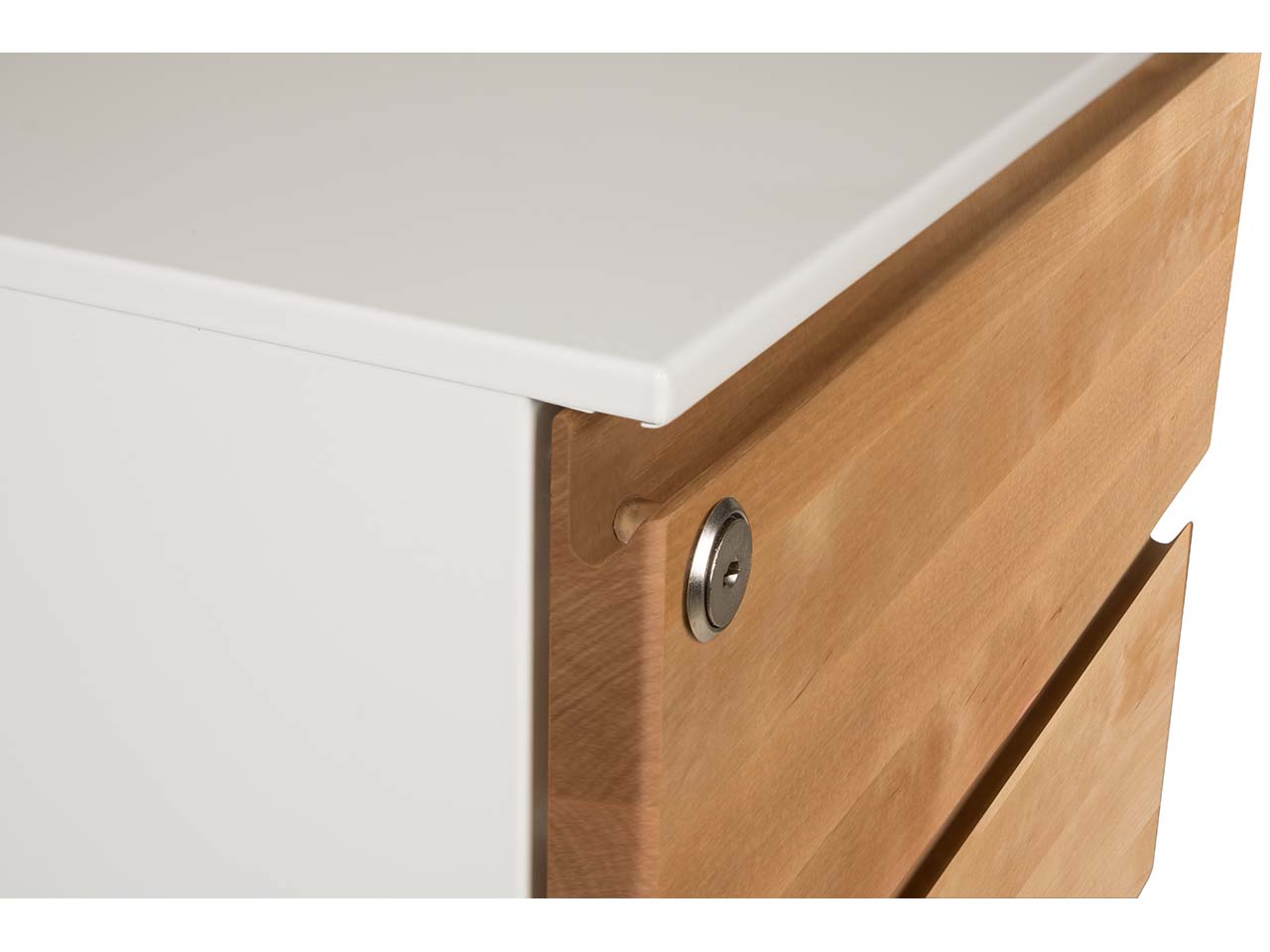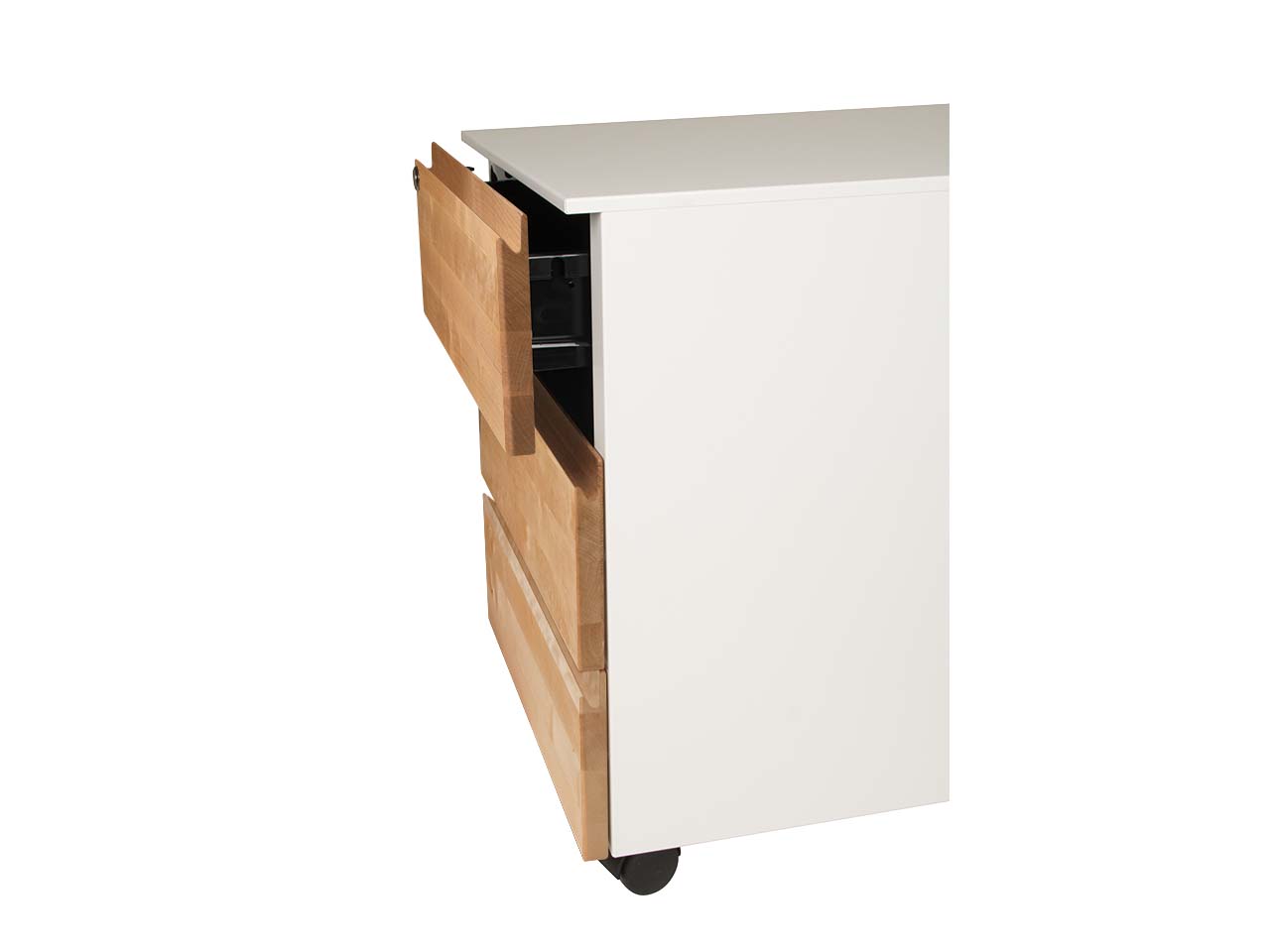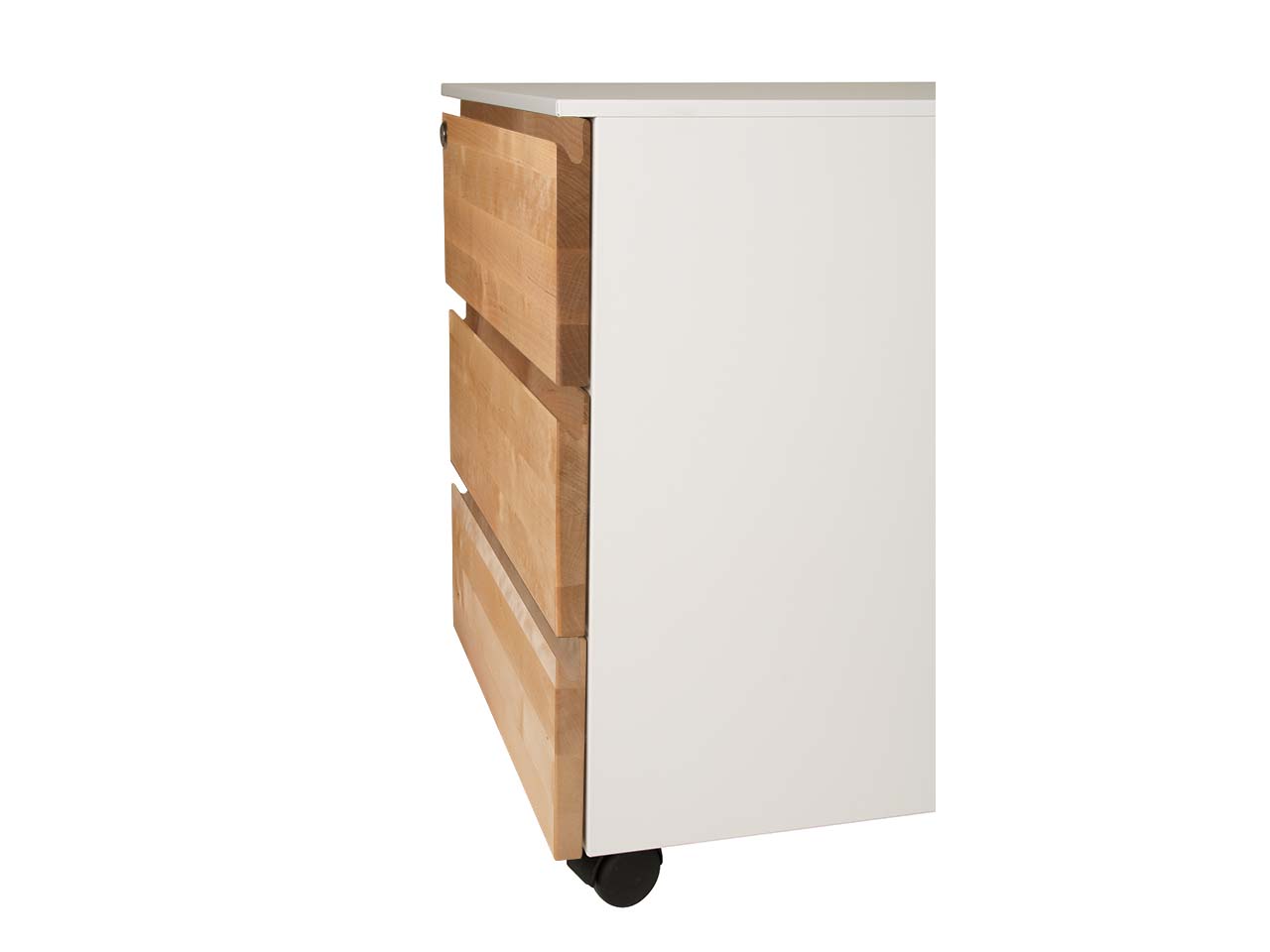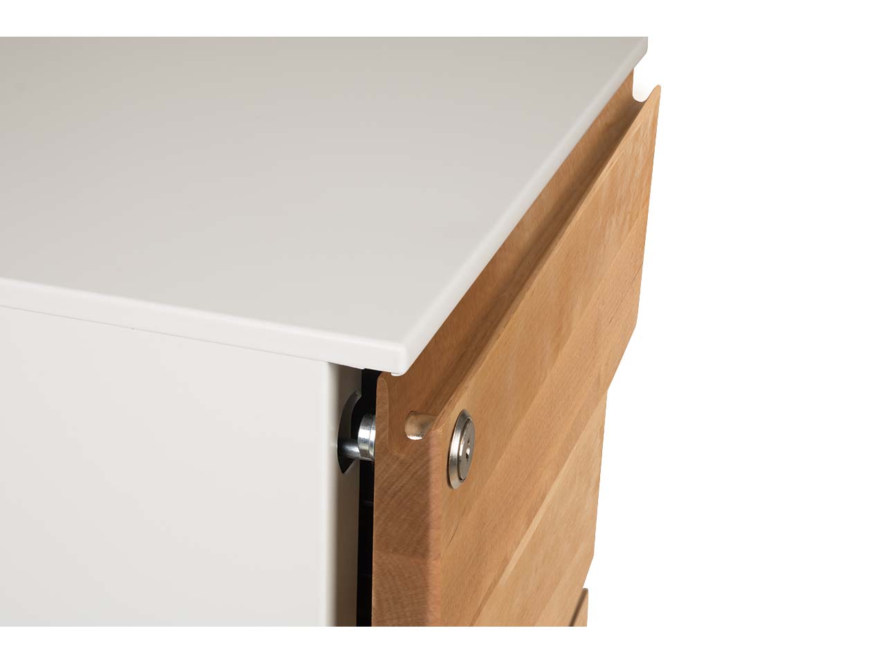 Der Rollcontainer ist perfekt für Homeoffice oder Büro. Er überzeugt gleichermaßen mit exzellenter Stabilität und hochwertigem, modernem Design. Dieses zeichnet sich durch die Kombination aus Metall und Holz aus: Der Korpus besteht aus weiß gepulvertem Stahl und die Fronten der Schubladen aus geöltem Massivholz. Zur Auswahl stehen hier Eiche, Birke, Buche oder Robinie. Durch die mit pflanzlichem Öl behandelte Oberfläche erhält das Holz eine wunderbare Haptik. Die 3 Schubladen schließen mit soft-close und bieten viel Platz, um Dokumente, Unterlagen und Co. ordentlich zu verstauen. Zum besseren Schutz von sensiblen und wichtigen Informationen ist der Rollcontainer abschließbar.