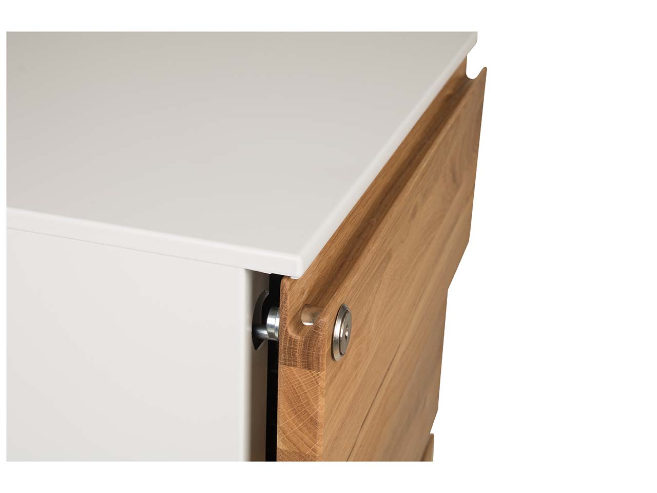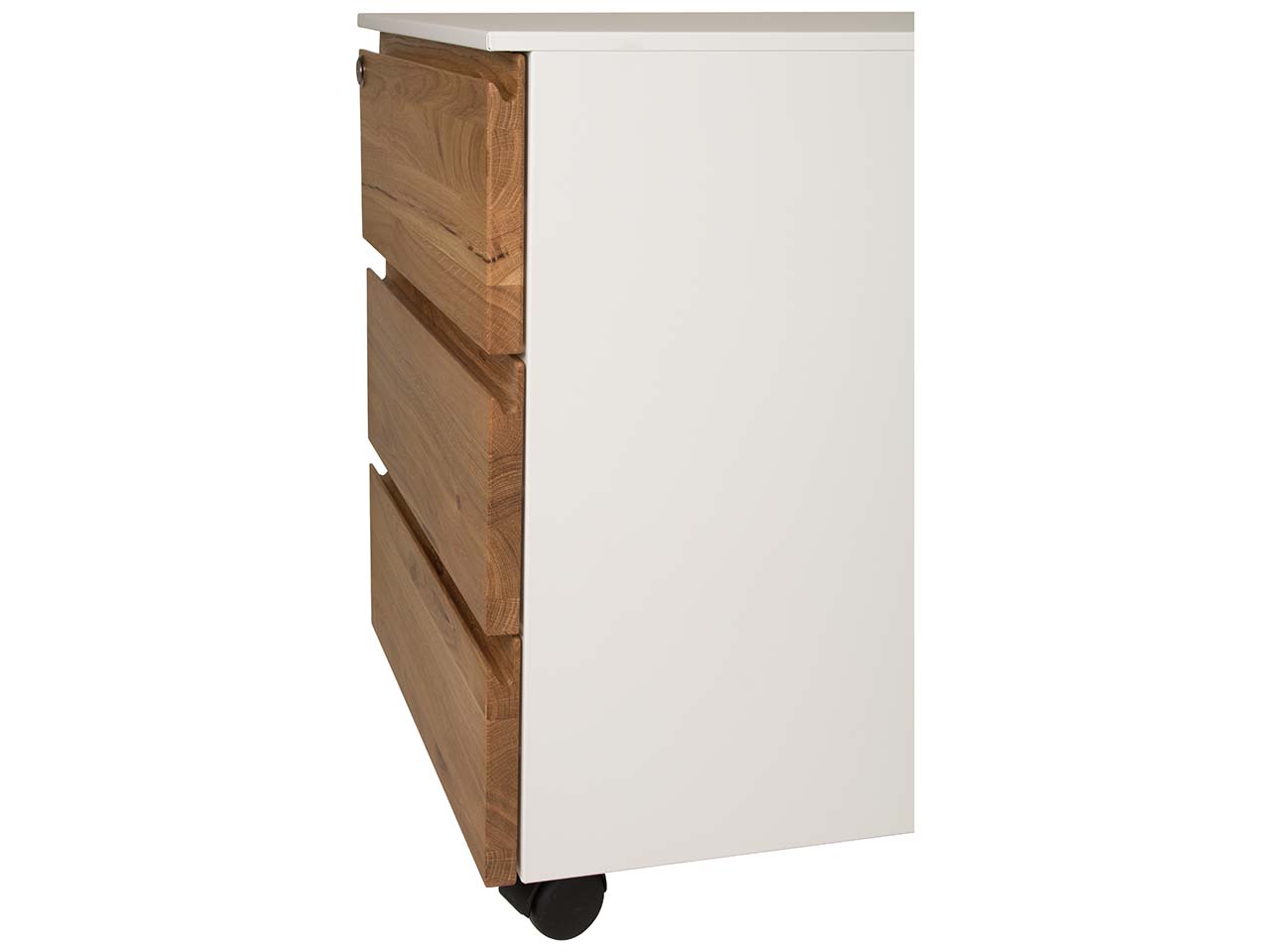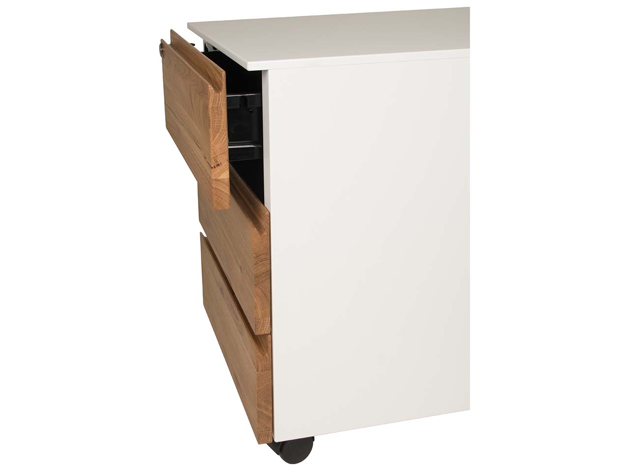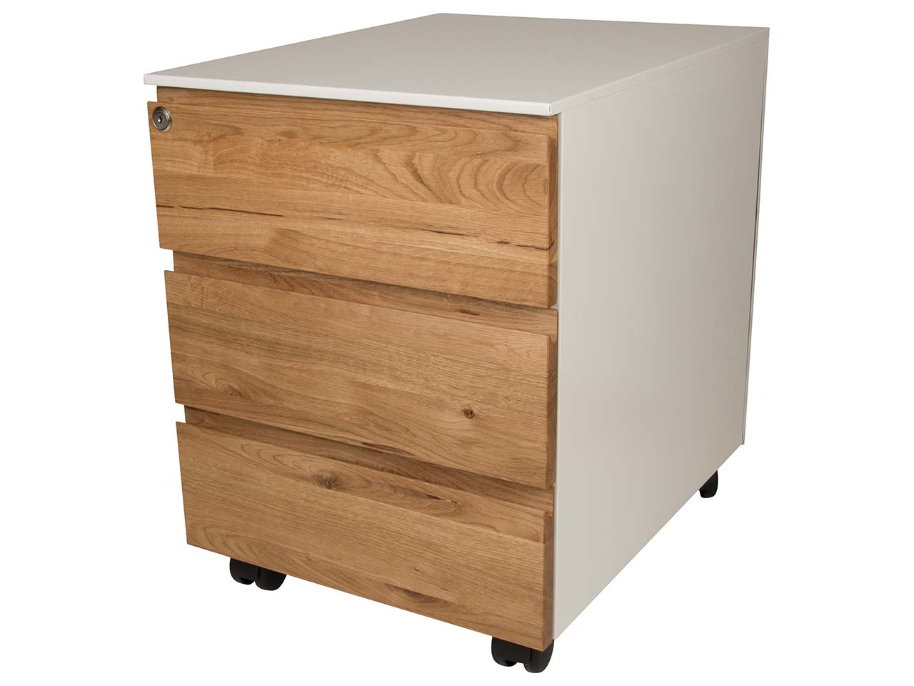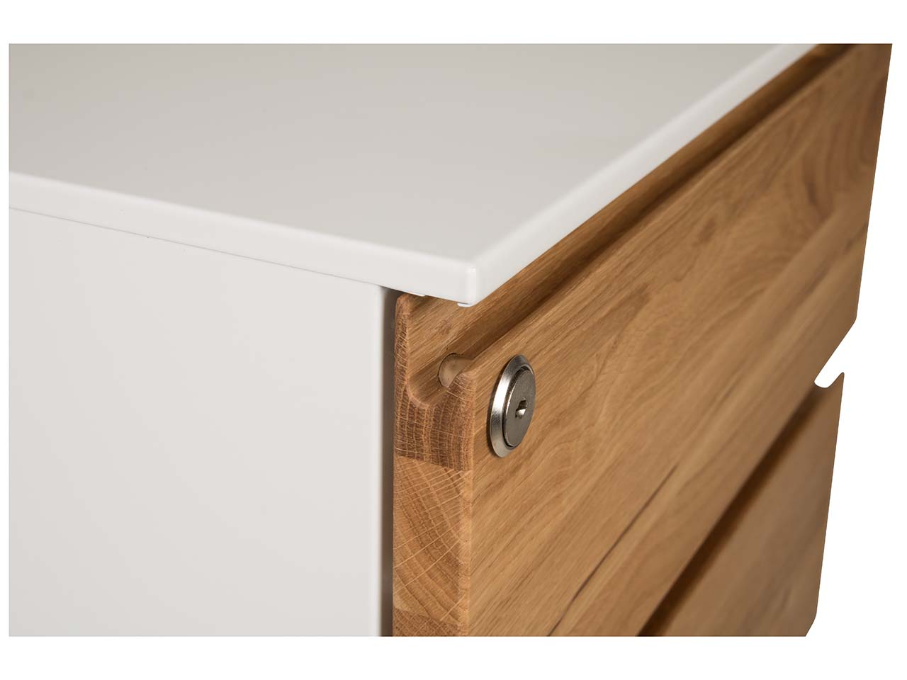 Der Rollcontainer ist perfekt für Homeoffice oder Büro. Er überzeugt gleichermaßen mit exzellenter Stabilität und hochwertigem, modernem Design. Dieses zeichnet sich durch die Kombination aus Metall und Holz aus: Der Korpus besteht aus weiß gepulvertem Stahl und die Fronten der Schubladen aus geöltem Massivholz. Zur Auswahl stehen hier Eiche, Birke, Buche oder Robinie. Durch die mit pflanzlichem Öl behandelte Oberfläche erhält das Holz eine wunderbare Haptik. Die 3 Schubladen schließen mit soft-close und bieten viel Platz, um Dokumente, Unterlagen und Co. ordentlich zu verstauen. Zum besseren Schutz von sensiblen und wichtigen Informationen ist der Rollcontainer abschließbar.