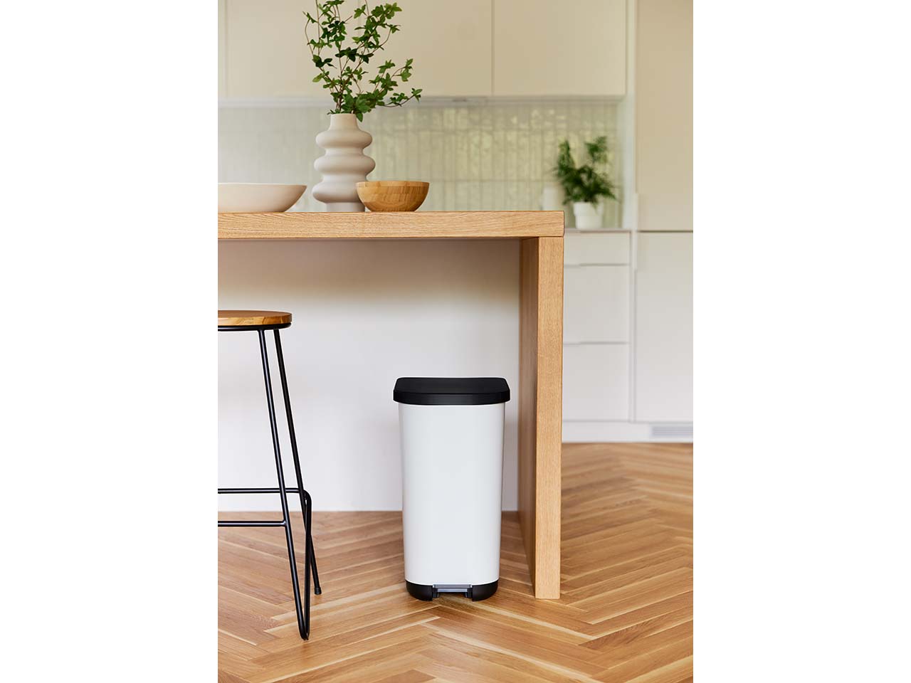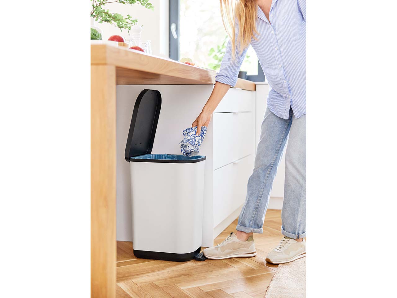 Dieser clevere, robuste Treteimer ist ein wahres Platzwunder. Dank des verstellbaren Rings passt er sich mühelos an Mülltüten zwischen 25 und 40 l an und sorgt so für eine flexible Nutzung. Der drehbare Auslaufschutzeinsatz hingegen ermöglicht eine variable Füllhöhe. Wo der Abfalleimer aus Recyclingkunststoff auch aufgestellt wird, er schließt mit dem Dämpfer immer leise. Das platzsparende Design fügt sich harmonisch in Küche, Bad und überall dort ein, wo er gebraucht wird. B 40 x T 28,5 x H 51,3 cm.