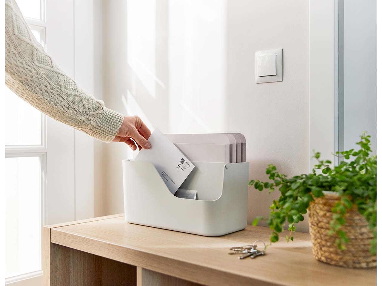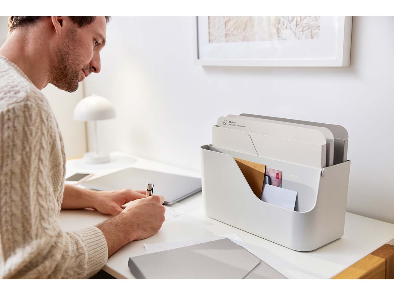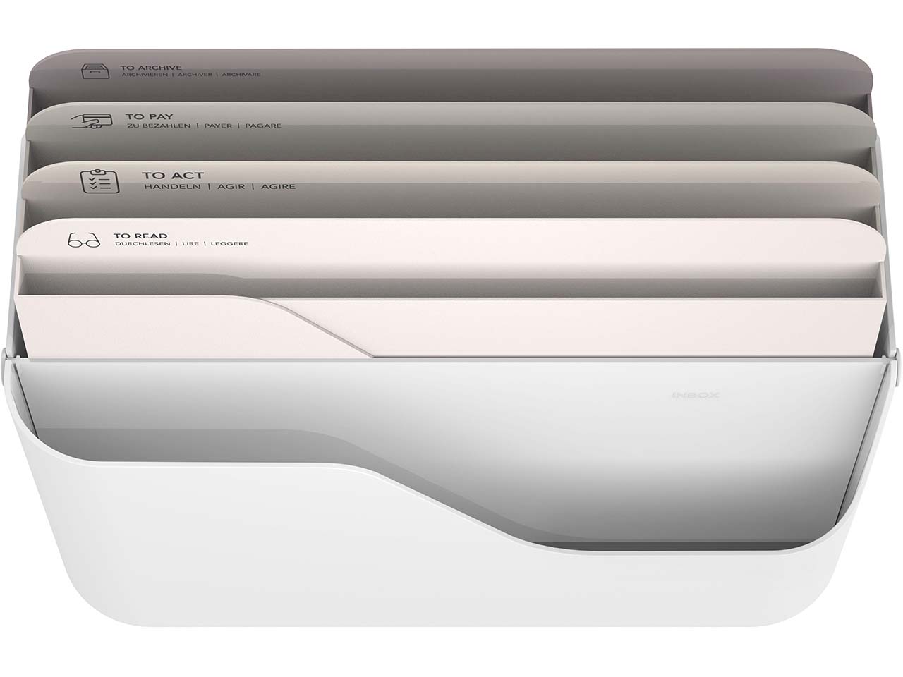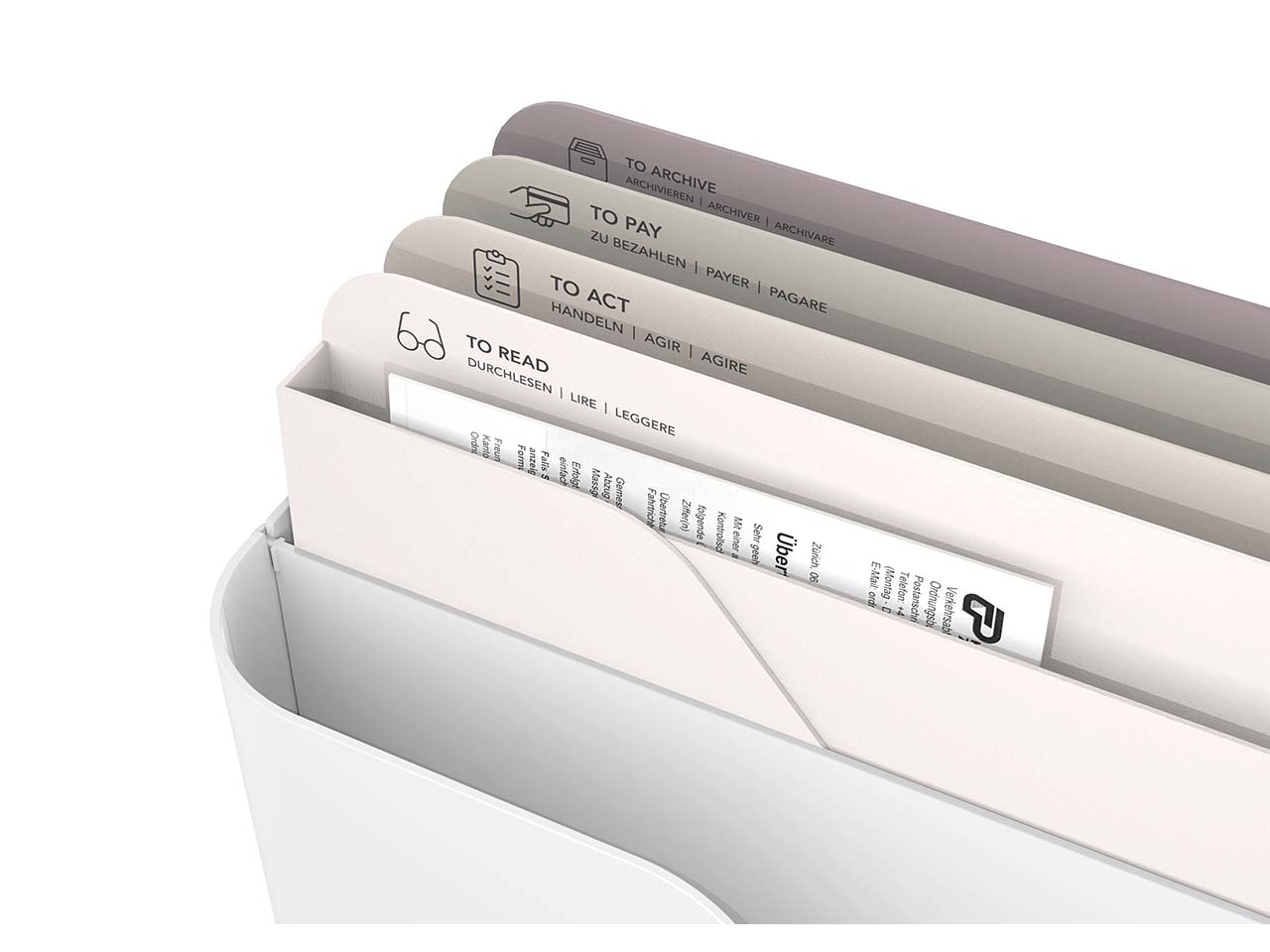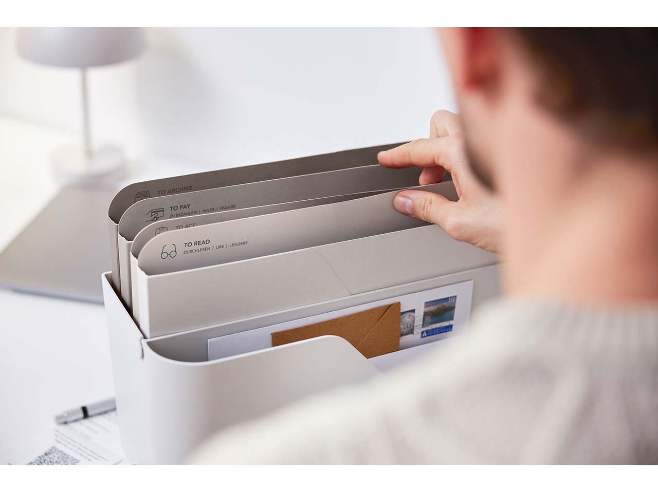 Im Home Office oder im Büro bestens organisiert: Der Dokumentenorganizer hilft dabei, den Überblick zu behalten. Die vier flexiblen, vorbeschrifteten Mappen aus festem Karton machen das Ablegen und Entnehmen von Unterlagen kinderleicht. Selbst kleine Dokumente wie Ausweise, Versicherungskarten und Co. können in einer Lasche aufbewahrt werden, sodass sie nicht verloren gehen. Das Vorderfach eignet sich ideal, um neu eingehende Dokumente wie Briefe zwischenzulagern. Mit den Kategorien Archivieren, Bezahlen, Handeln und Durchlesen sind die Kategorien besonders gut durchdacht. Der Organizer für DIN-A4-Dokumente ist aus Post-Consumer Recyclingkunststoff hergestellt.