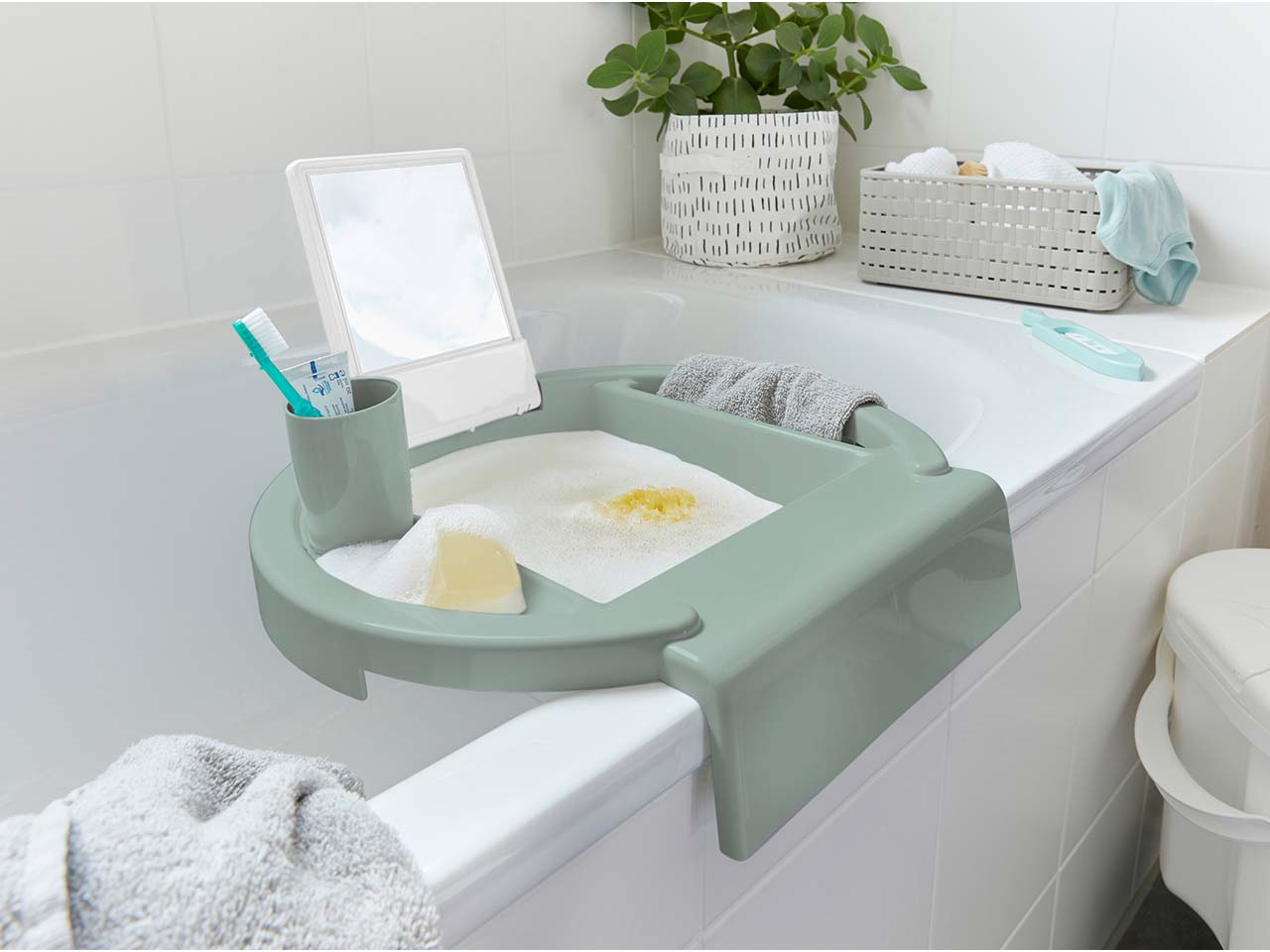 Hände waschen und Zähne putzen für die Kleinsten leicht gemacht! Das praktische Waschbecken aus recyceltem Kunststoff muss nur am Rand der Badewanne angebracht werden und schon haben Kinder ihr ganz eigenes Waschbecken mit Spiegel – dieser ist sogar unzerbrechlich. Platz für den Zahnputzbecher ist auf der Ablage, genauso wie für Seife. Am Haltegriff können Waschlappen oder Handtuch angebracht werden. Über den Ablaufstopfen ist das Wasser kinderleicht in die Badewanne abgelassen. Das Waschbecken ist für Kinder ab 12 Monaten geeignet. Für Badewannen mit einer Wannenrandbreite bis 8 cm. B 40 x T 40 x H 13 cm.