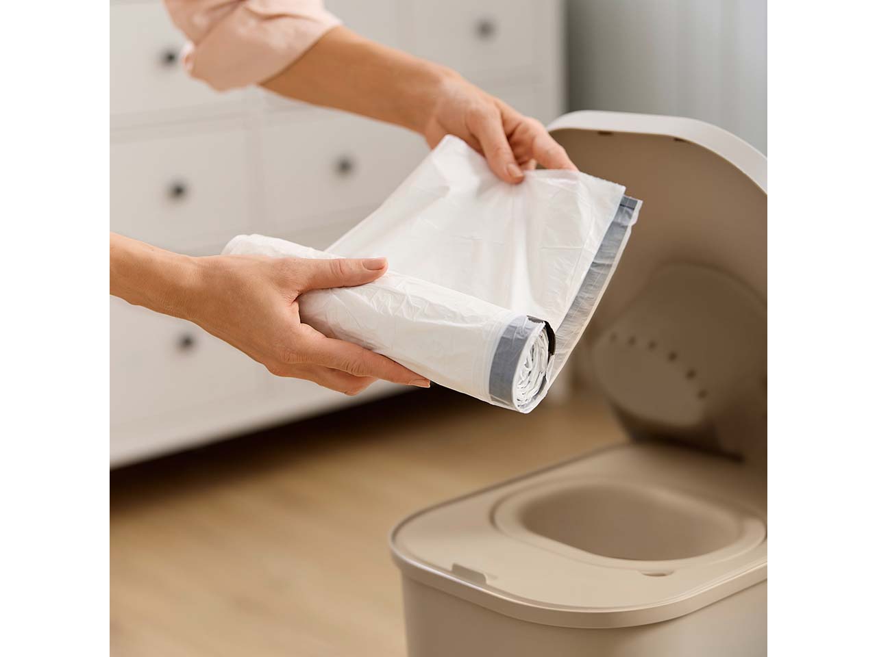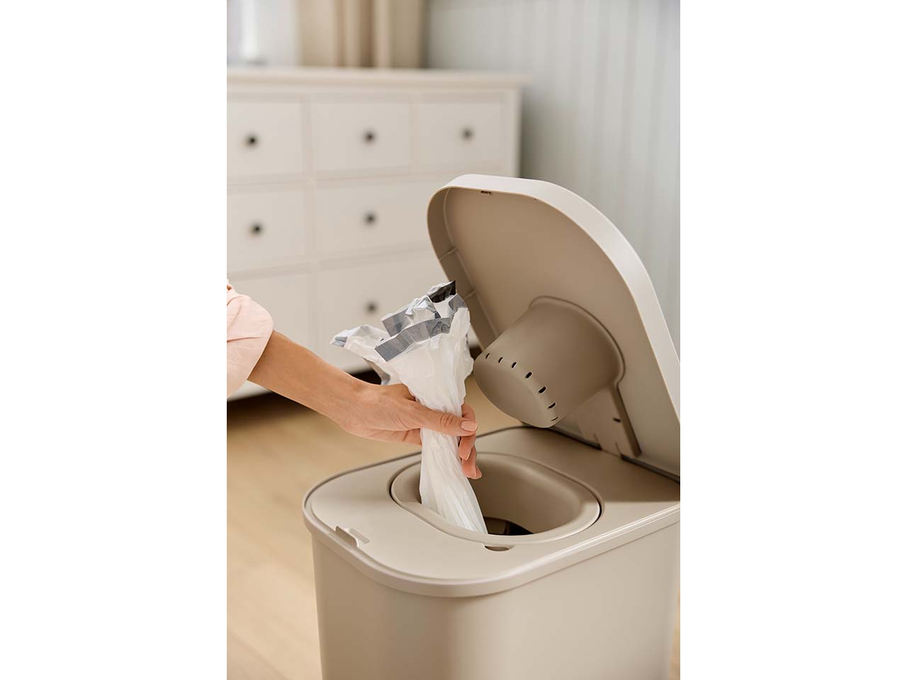 Mit diesem niedlichen Windeleimer gestaltet sich die Entsorgung von Windeln hygienisch, geruchsfrei und ganz einfach! Dank dem innovativen Zwei-Kammer-System werden Gerüche effektiv eingeschlossen. Der Windeleimer, der zu 93 % aus recyceltem Kunststoff besteht, lässt sich mit Fußpedal komfortabel und freihändig öffnen. Die passgenauen, separat erhältlichen Windeleimer-Beutel ermöglichen eine reibungslose Funktionalität.