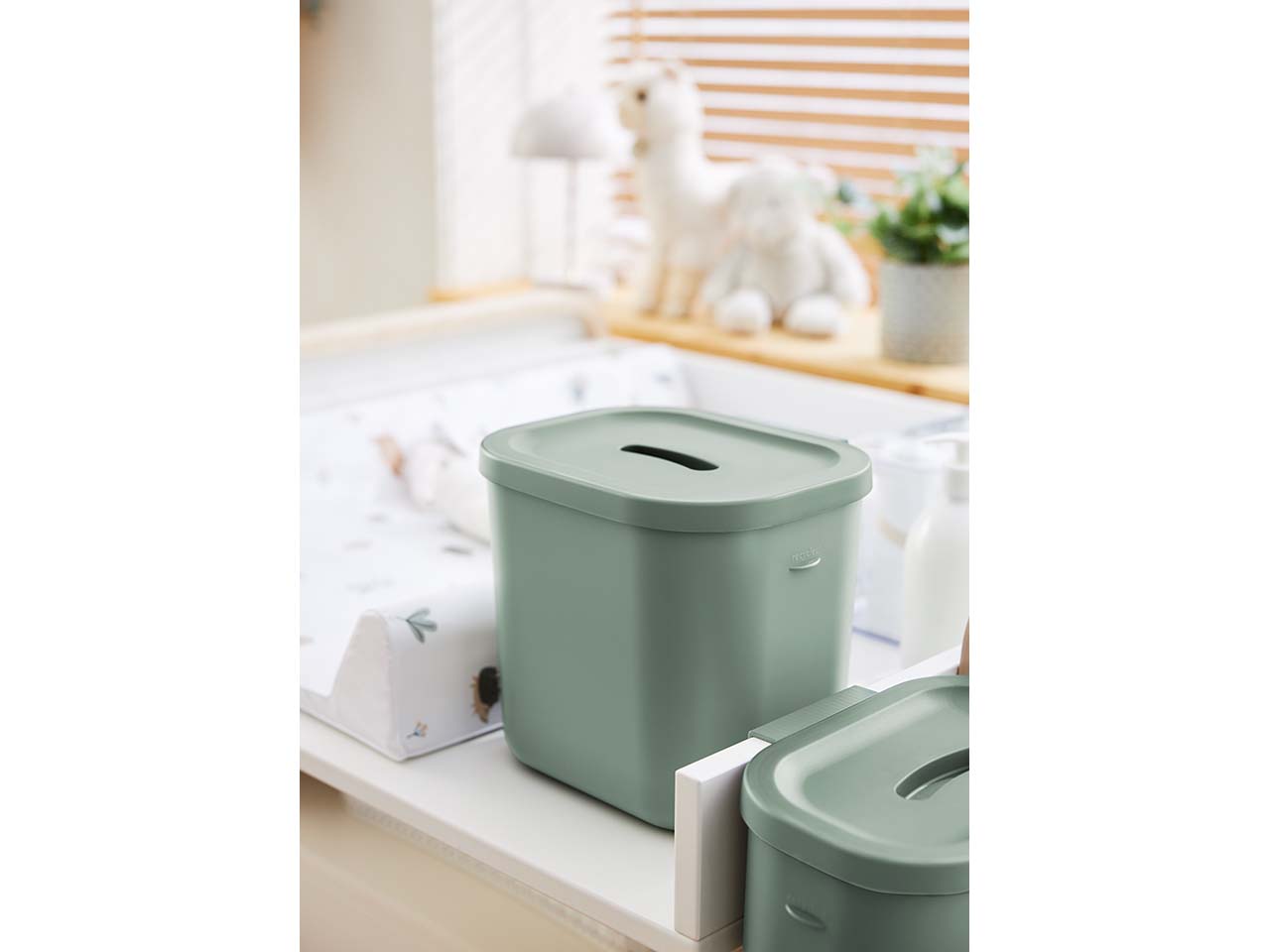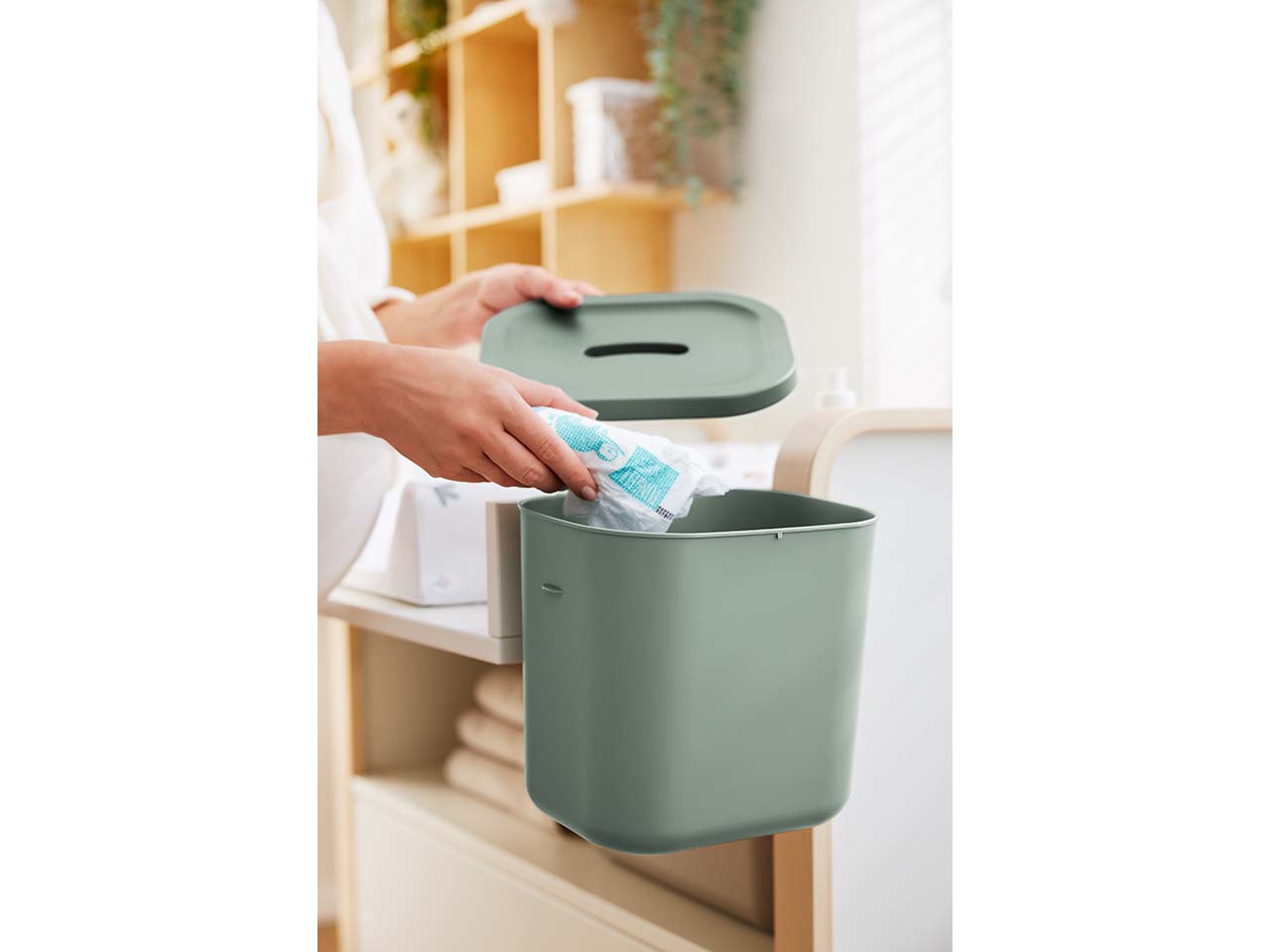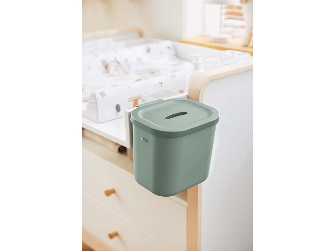 Der Windeleimer aus Recyclingkunststoff ist immer griffbereit! Er wird direkt am Wickeltisch angebracht und ist ideal, um Windeln zu entsorgen. Diese werden einfach durch den Schlitz ins Innere befördert. Dafür wird nur eine Hand benötigt! Zum Ausleeren wird einfach der Deckel abgenommen. Ein unverzichtbares Zubehör beim Wickeln. B 23,5 x T 202, x H 20,8 cm.