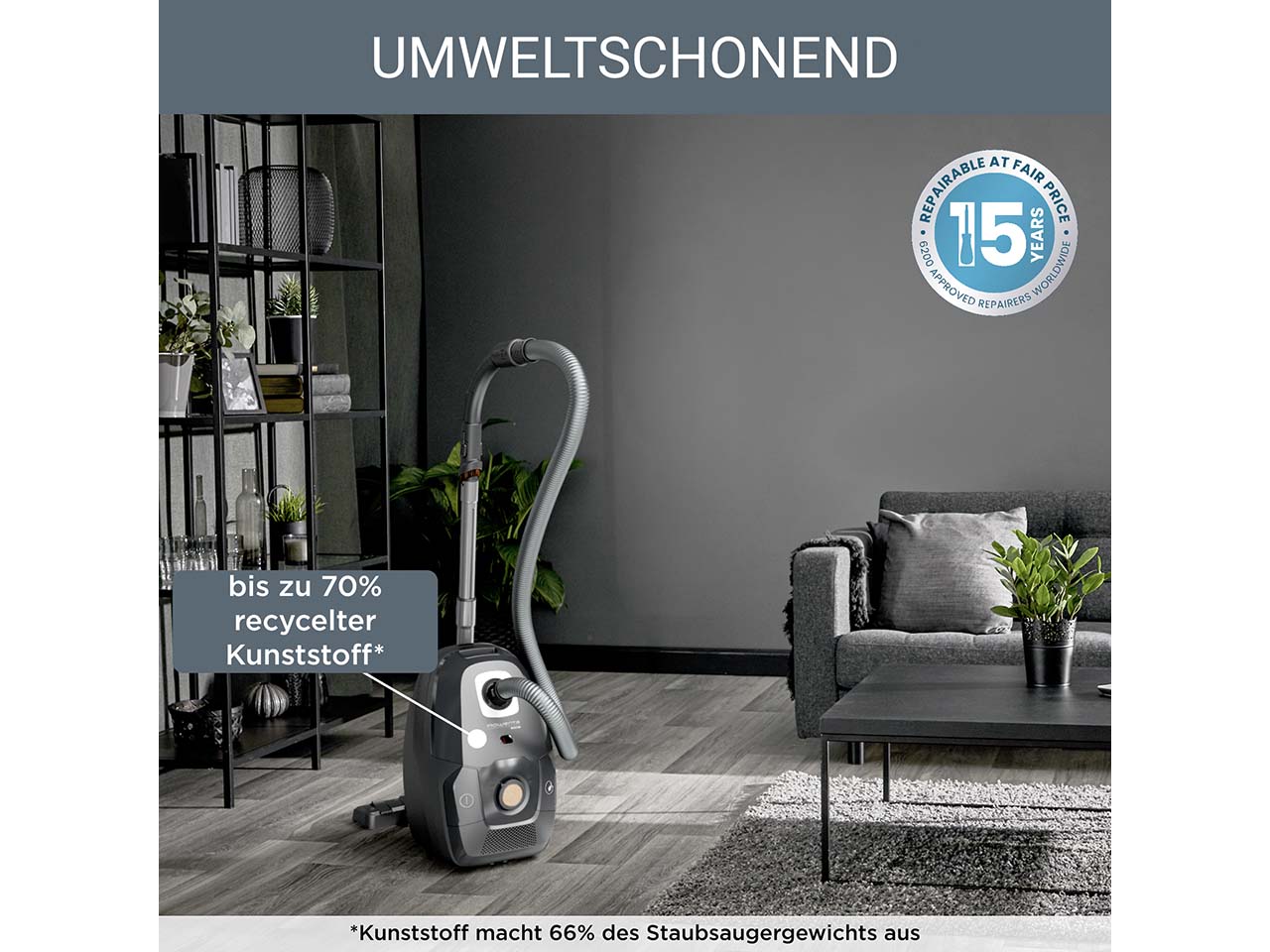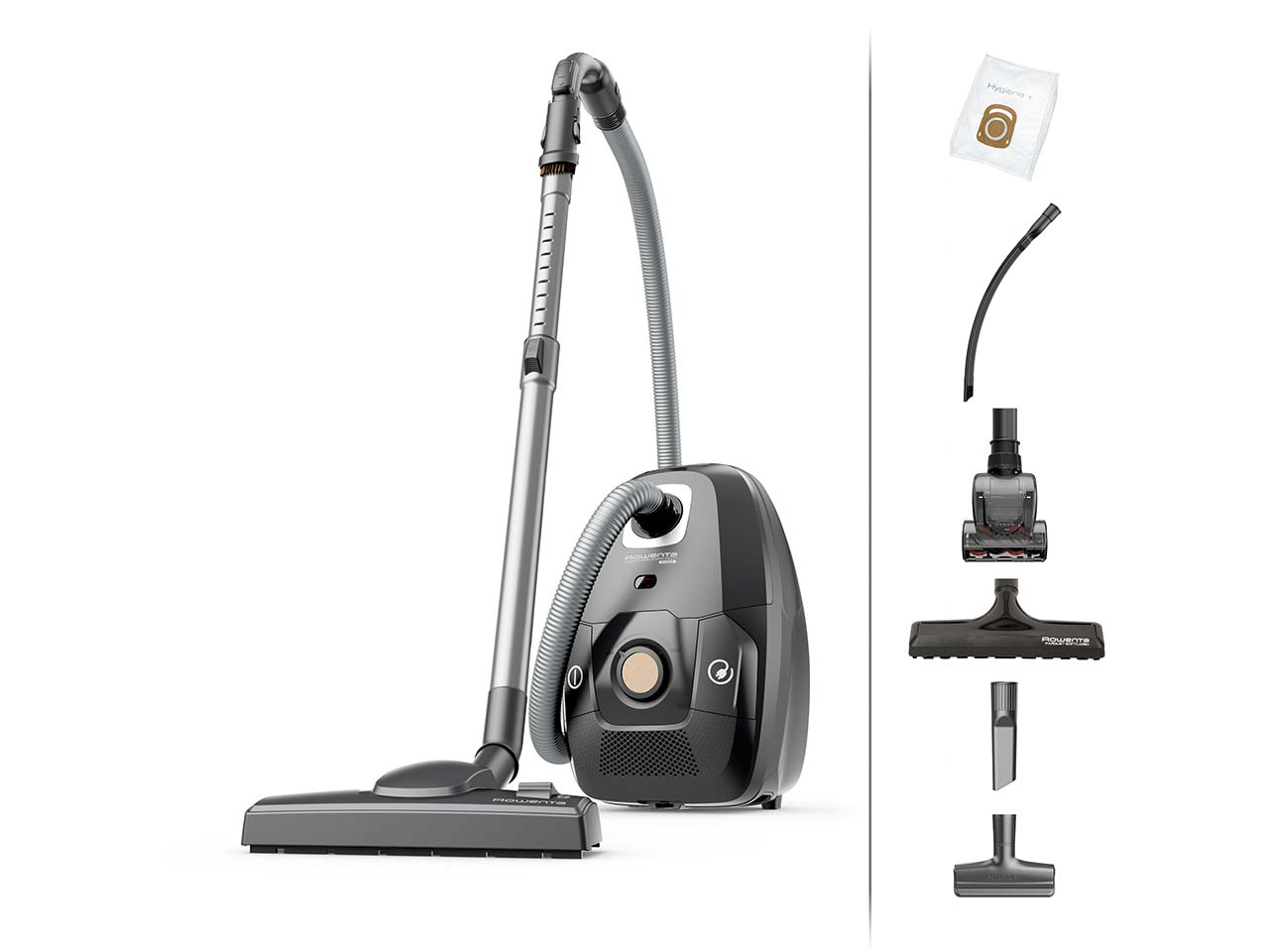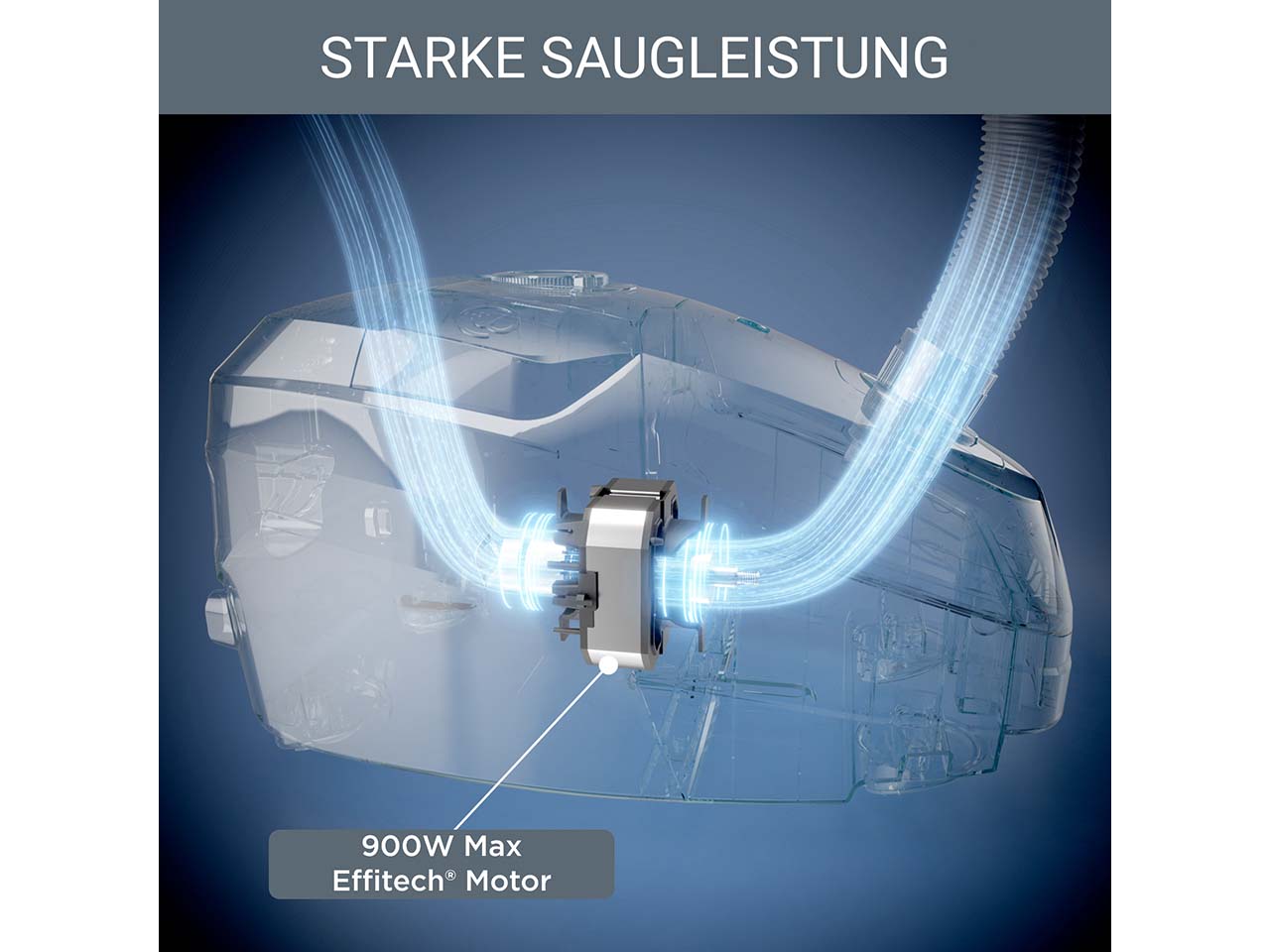 Der Staubsauger von Rowenta schafft es, hohe Reinigungsleistung mit umweltgerechtem Design zu verbinden. Der Effitech®-Motor liefert maximale Saugleistung bei niedrigem Energieverbrauch. Gleichzeitig besteht das Gehäuse bis zu 70 % aus Recyclingkunststoff. Damit setzt sich der Bodenstaubsauger von herkömmlichen Geräten ab. Mit einem Geräuschpegel von nur 64 dB arbeitet der Staubsauger besonders leise. 12 m Aktionsradius ermöglichen ein komfortables Saugen ohne ständiges Umstecken. Das Hygiene+ Beutelwechselsystem vermeidet den Kontakt zu Staub – ideal für Menschen mit Allergien.