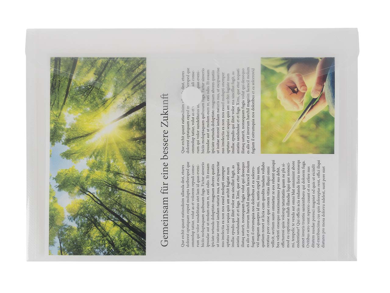 Die ansprechende Sammelmappe in Kuvertform ist aus transparentem, flexiblem PP hergestellt. Dank Klettverschluss schließt die Mappe einfach und sicher. Für Format DIN A4. B 335 x H 235 mm.