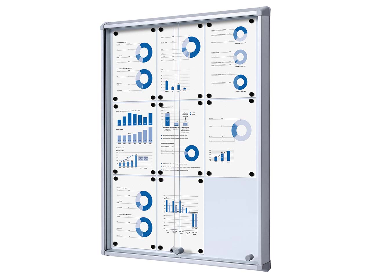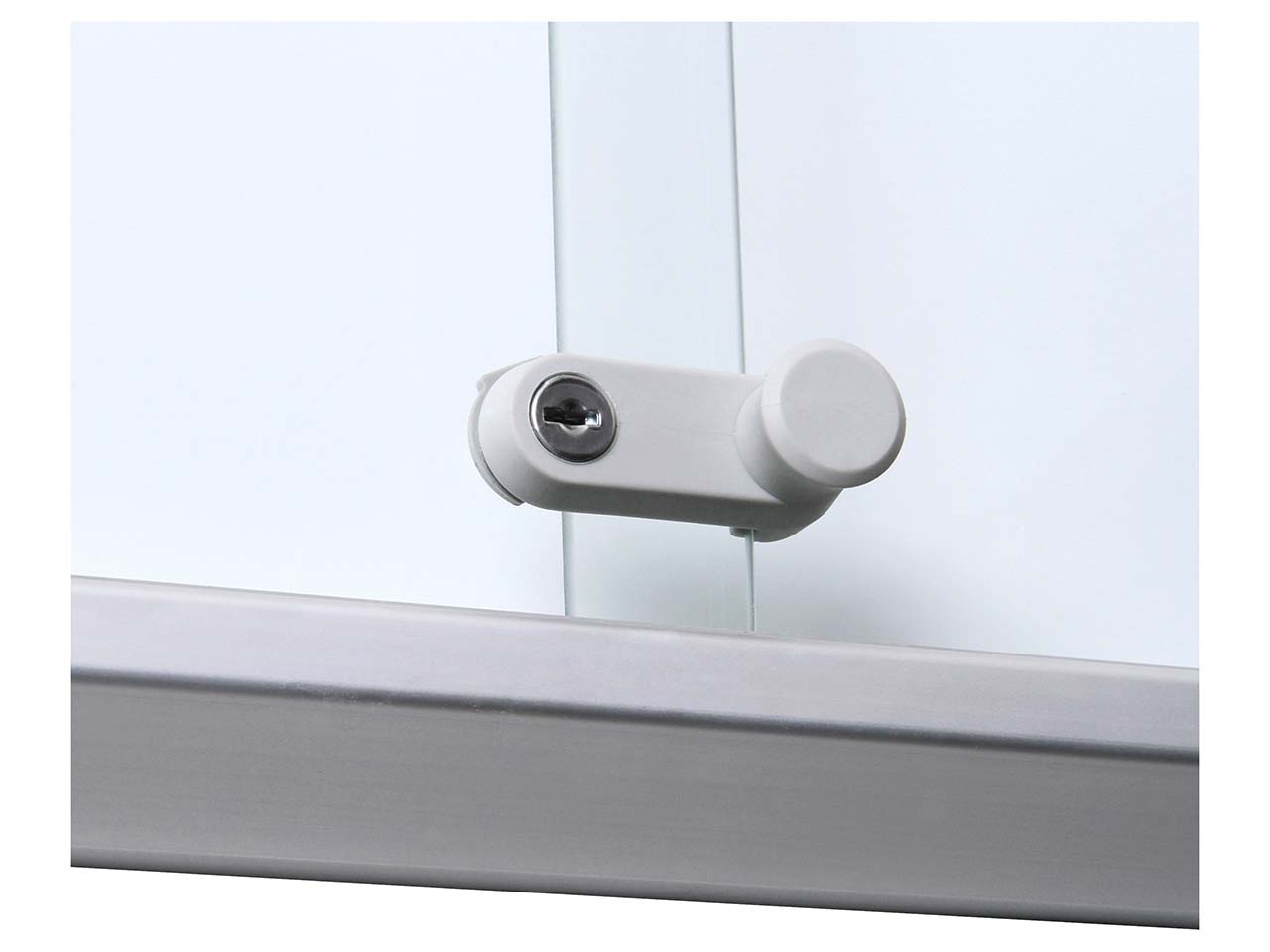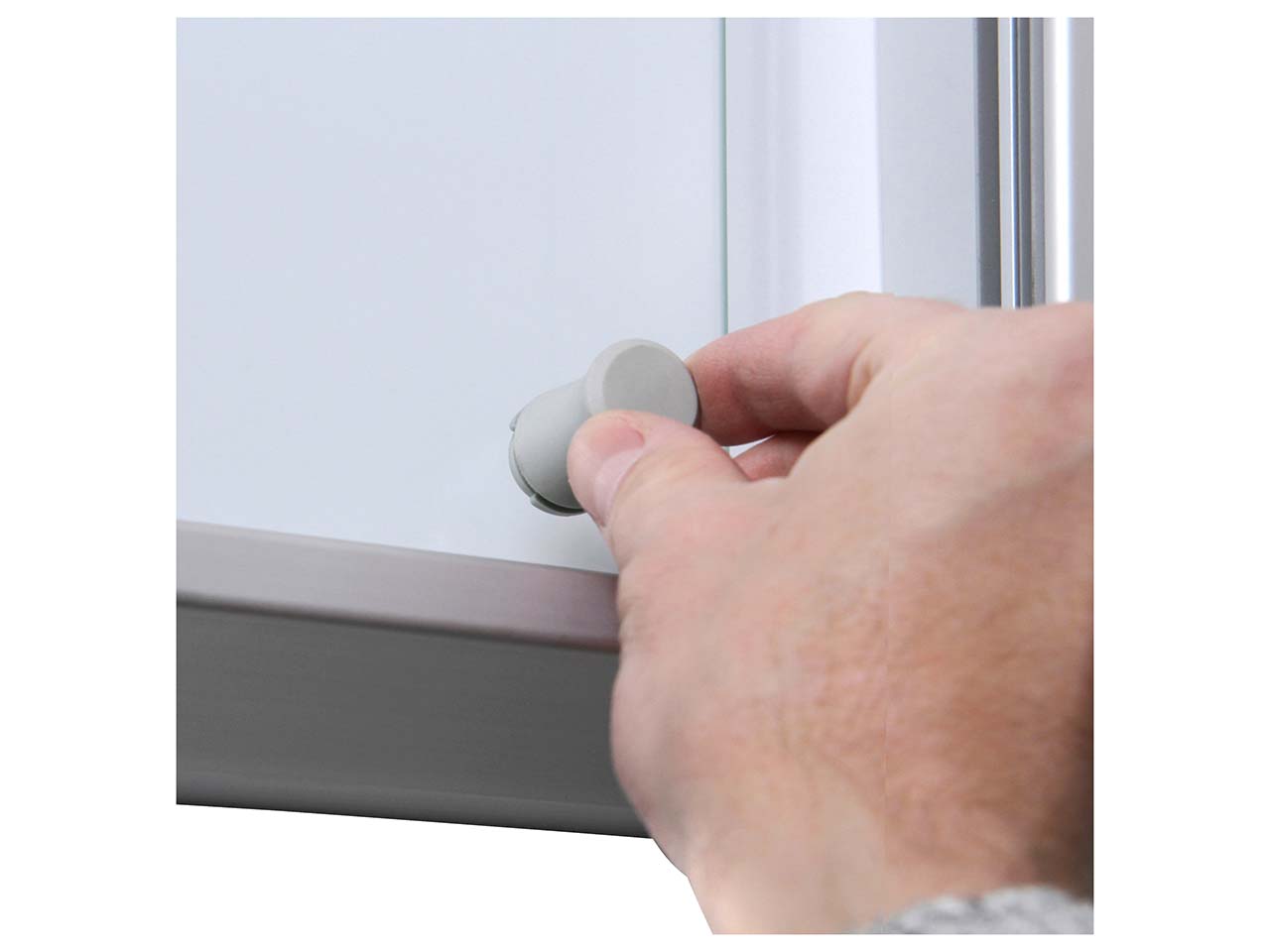 Der elegante Aluminium-Schaukasten "Sven" mit 2 transparenten Schiebetüren aus ESG-Sicherheitsglas, leicht abgerundete Kunststoffecken und Griff-Schloss (inkl. 2 Schlüssel) ist nach Brandschutzklasse B1 zertifiziert. Magnethaftende, beschreibbare Stahlblech-Rückwand. Präsentiert Informationen in Eingangsbereichen und Fluren perfekt. Profil 30 mm.