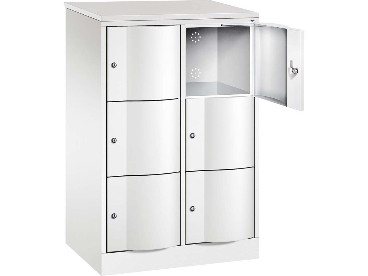 Der doppelstöckige Stahl-Garderobenschrank bietet mit zwei Abteilen und je zwei Fächern pro Abteil eine durchdachte Lösung für sichere und geordnete Aufbewahrung. Der Korpus besteht aus einer stabilen Stahlkonstruktion mit hochwertiger Einbrennbeschichtung, die hervorragenden Schutz vor UV-Strahlen und Korrosion gewährleistet. Die 1,5 mm starken Stahltüren sind nach vorne gewölbt, extrem stabil und vandalismussicher. Dank robuster Drehstangenscharniere und Anschlagsdämpfern sind sie langlebig und bedienungsfreundlich. Jedes Fach verfügt über eine Garderobenstange mit drei verdrehsicheren Schiebehaken. Die Rückwand ist mit großflächigen Luftdurchlässen versehen, die für optimale Belüftung sorgen. Der 100 mm hohe Sockel mit 30 mm Niveauregulierung ermöglicht einen sicheren Stand auch auf unebenen Böden. Drehzylinderschlösser sorgen für zusätzliche Sicherheit, und der geschlossene Sockel erleichtert die Bodenreinigung. Erhältlich mit 4, 6 oder 10 Türen. B 77,2 x T 54 x H 195 cm.