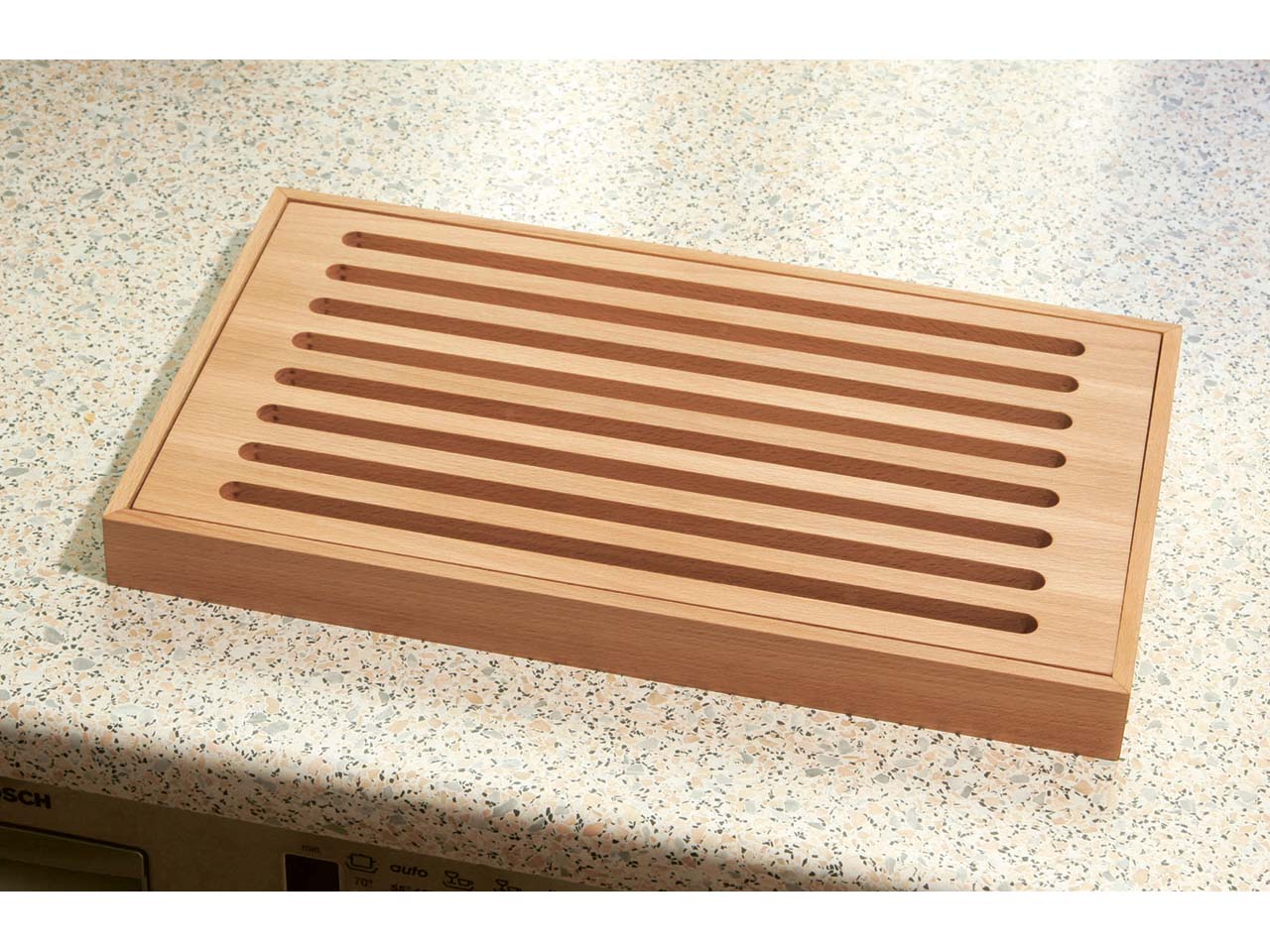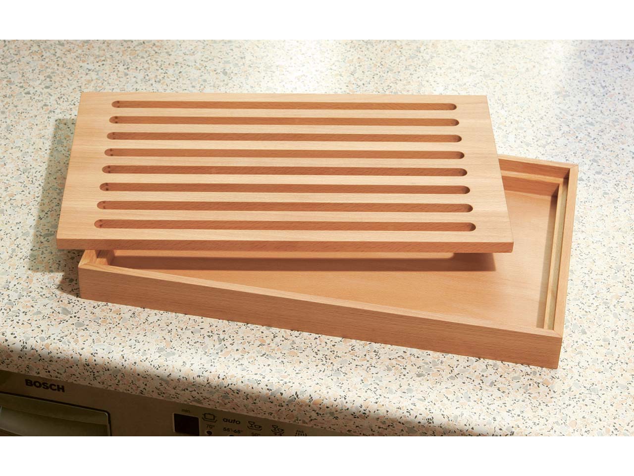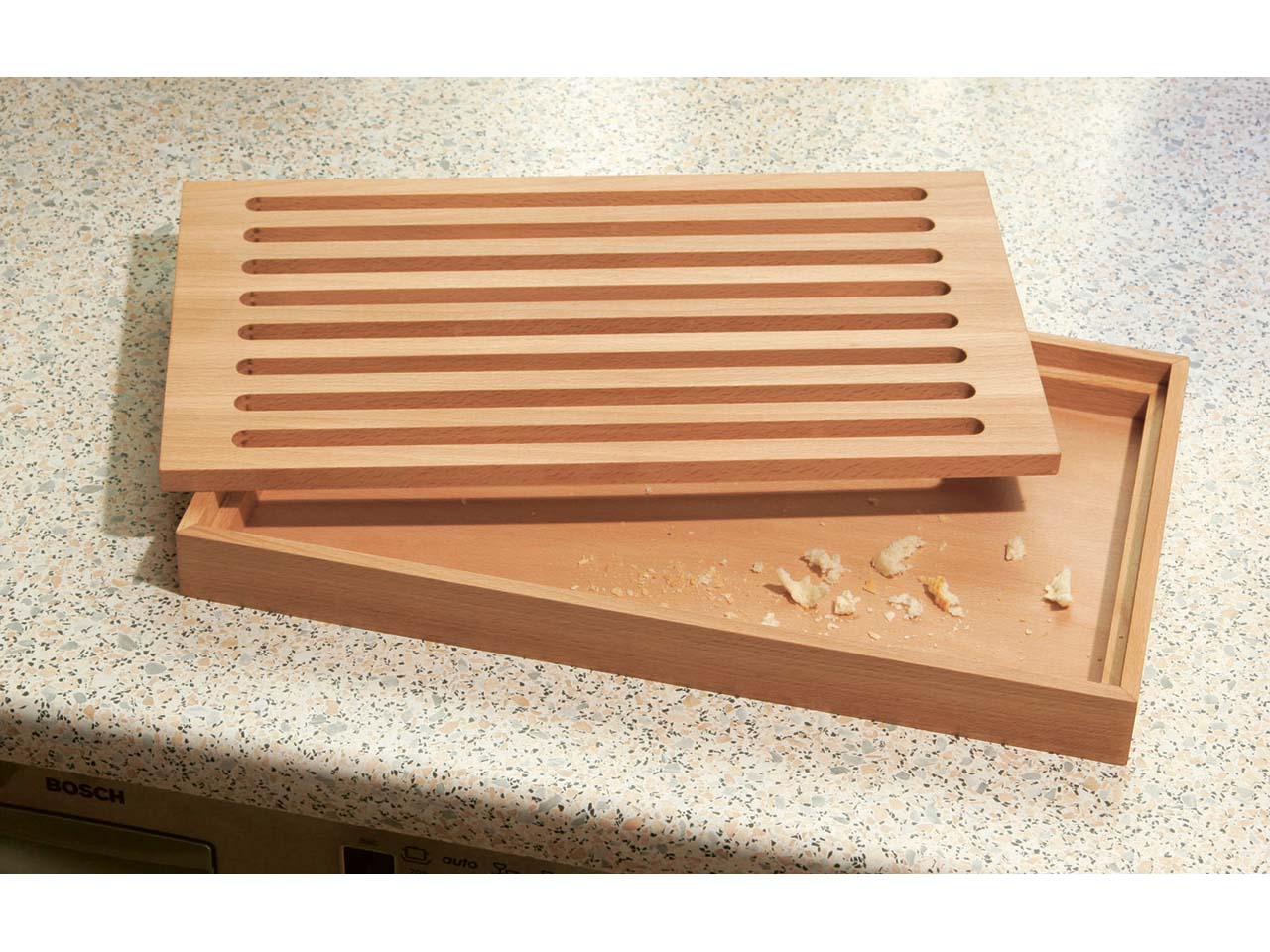 Das Schneidebrett aus Holz macht Schluss mit der lästigen Krümelei: Beim Brotschneiden fallen die Brösel durch das herausnehmbare Gitter in die Auffangschale. Aus FSC-zertifizierter, massiver und geölter Buche handgefertigt, stabil vernutet. B 23,3 x T 40 x H 3,5 cm.
