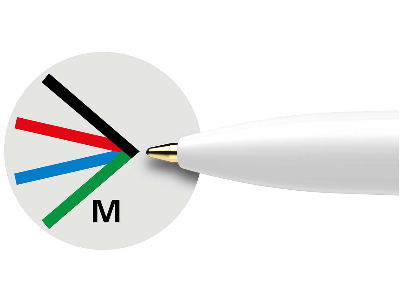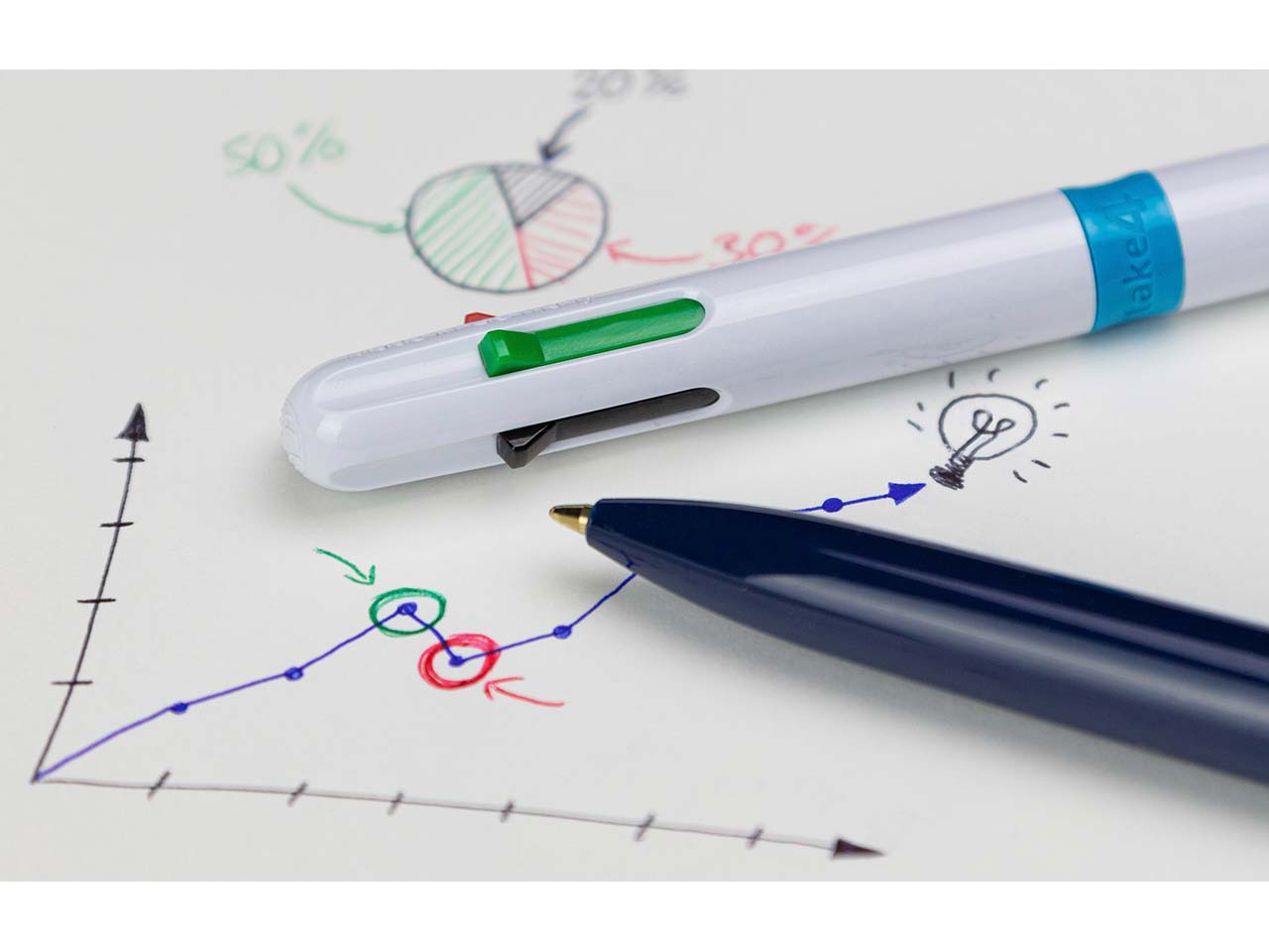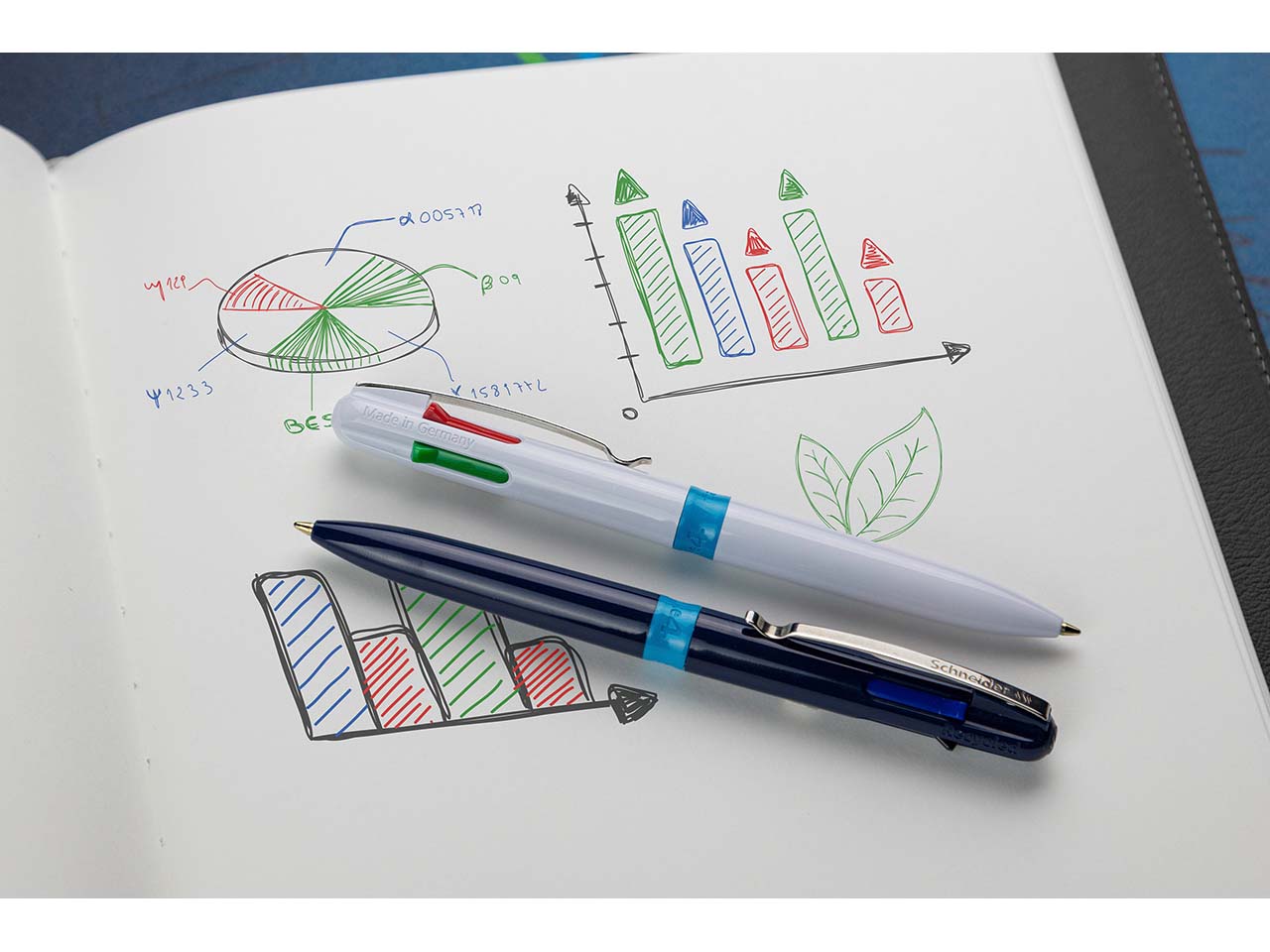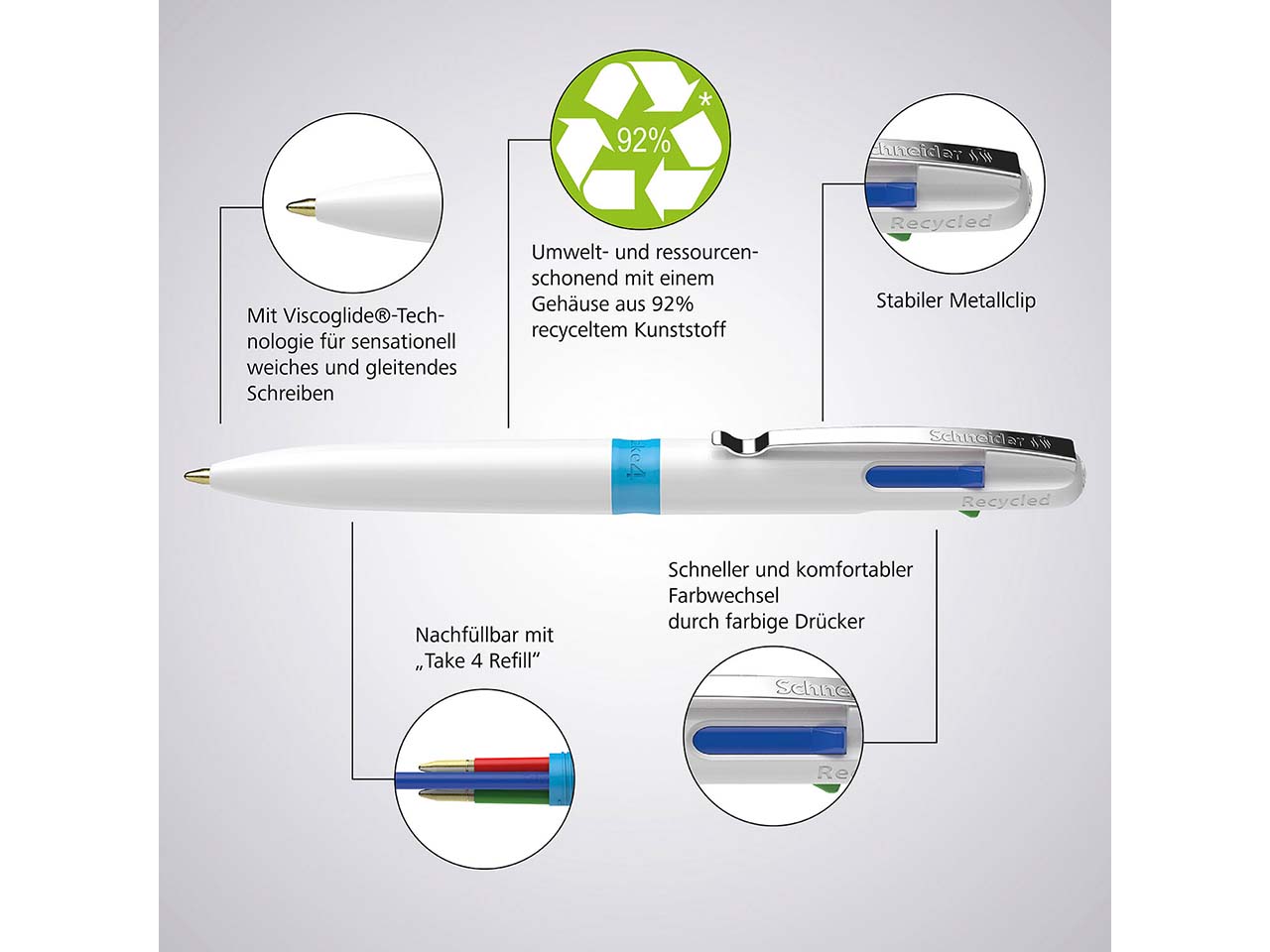 Der Schneider Kugelschreiber "Take 4" ist mit den Schreibfarben schwarz, blau, rot und grün die perfekte 4-in-1-Lösung. Nutzen Sie das Schreibgerät, um zu planen, organisieren und strukturieren. Der farbige Drücker ermöglicht ein schnelles, komfortables Wechseln zwischen den einzelnen Schreibfarben. Durch die Viscoglide-Technologie entsteht ein sehr weiches, gleitendes Schreibgefühl. Alle 4 Schreibfarben sind dokumentenecht nach ISO 12757-2. Mit praktischem Metallclip. Die Minen sind austauschbar.