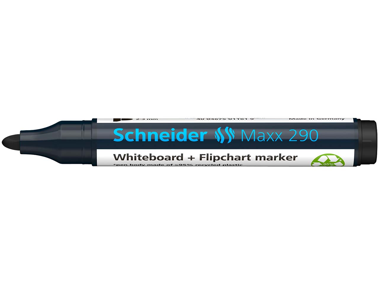Der geruchsarme Schneider Whiteboard- und Flipchartmarker "Maxx 290" mit Rundspitze ist dank kräftiger, farbintensiver Schrift auf Tafeln und Papier auch in hinteren Reihen gut lesbar. Der Marker ist von Whiteboards rückstandsfrei trocken abwischbar und schlägt bei Flipcharts nicht auf nachfolgende Seiten durch. Die Cap-Off Tinte trocknet auch nicht aus, wenn der Marker 2 bis 3 Tage offen bleibt. Das neue, voluminöse Format gewährleistet höchste Markierleistungen. Der Marker schreibt weich und ohne Quietschen. Nachfüllbar mit Maxx 665 Refill-Station.