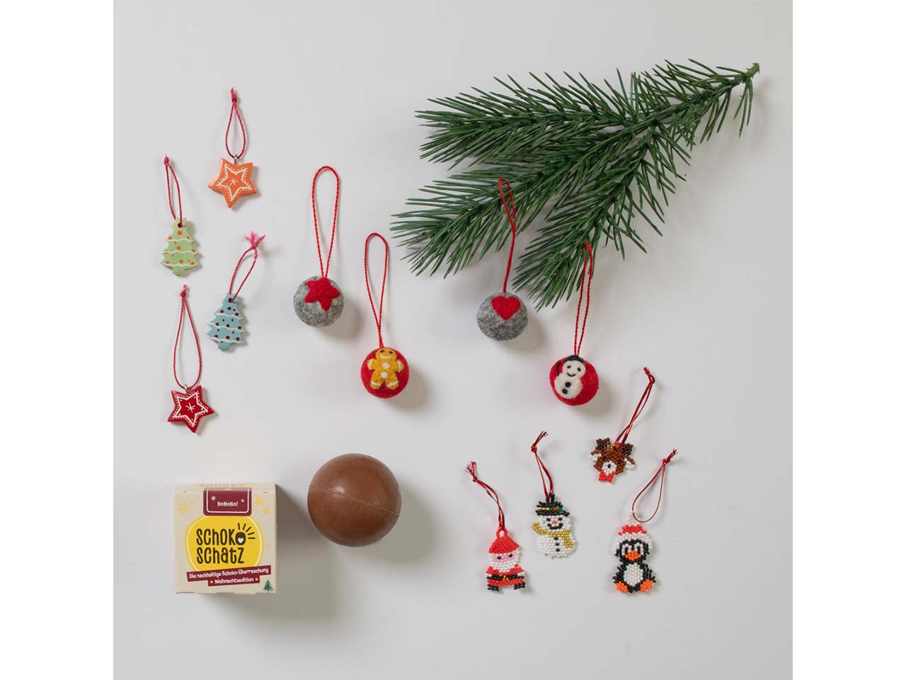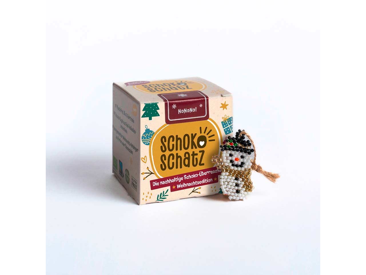 Schokolade und kleine Geschenke gehören zur Weihnachtszeit doch einfach dazu – der Schokoschatz verbindet beides ganz fair miteinander! In der Bio-Vollmilchschokoladenkugel mit einem Hauch von Zimt befindet sich ein handgemachter, fair gehandelter Weihnachtsanhänger als Überraschung. Die weihnachtlichen Anhänger werden in Südafrika, Nepal oder Kenia hergestellt. Die kunstvolle Handarbeit ermöglicht den Menschen vor Ort ein sicheres Einkommen, stärkt Gemeinschaften und bringt langfristige Beschäftigungsmöglichkeiten. Jeder Anhänger wird in liebevoller Handarbeit hergestellt und ist immer ein Unikat. Die Broschüre im Inneren gibt genaue Auskunft darüber, wo der Anhänger herkommt. Die Broschüre ist wie die gesamte Verpackung und die Fettbarriere frei von Plastik und kann so im Altpapier entsorgt werden!