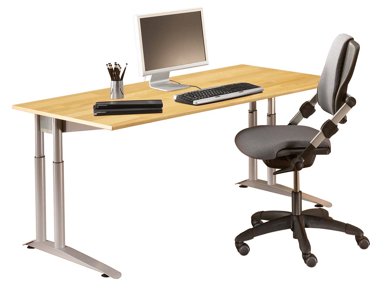 Der manuell in der Höhe verstellbare Schreibtisch zeichnet sich durch Strapazierfähigkeit und Flexibilität aus. Er hat ein Gestell aus langlebigem, gepulvertem Stahl und eine Tischplatte aus massiver Buche. Das Holz ist mit Öl auf Pflanzenbasis veredelt. Dadurch bleibt die Holzoberfläche offenporig, was sich positiv auf das Raumklima auswirkt. Das Buchenholz punktet mit angenehmer, rötlicher Farbgebung.