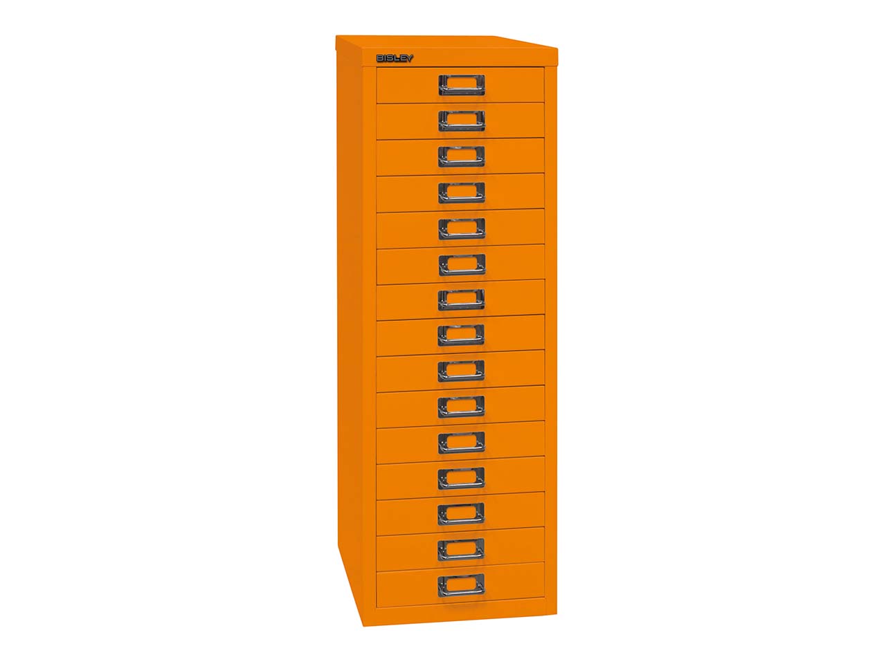 Der BISLEY Schubladenschrank vereinfacht die Aufbewahrung von Büroaccessoires. Der Schrank aus Stahl überzeugt mit Langlebigkeit und Stabilität. Die 15 Schubladen mit einer Höhe von 5,1 cm haben eine Kapazität von 2,8 kg. Geeignet für Kleinteile und Dokumente im Format DIN A4. B 27,8 x T 38 x H 85,7 cm. Farbe orange.