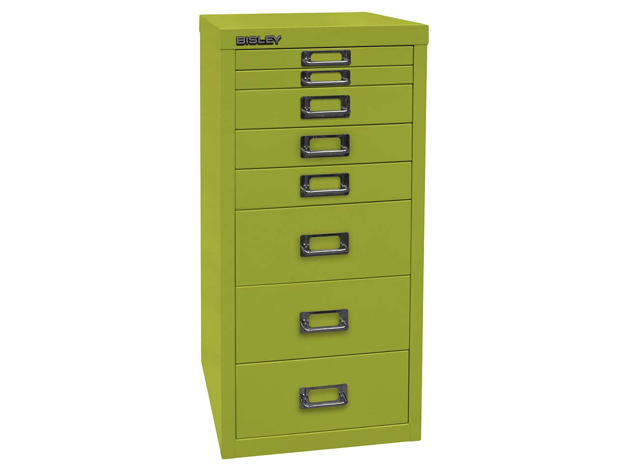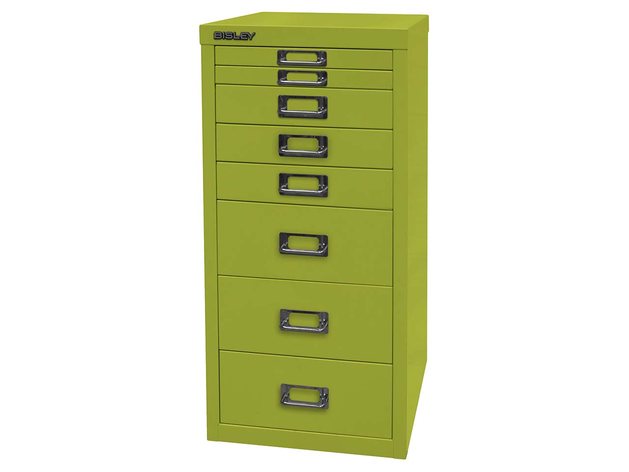 Mit dem BISLEY Schubladenschrank bleiben Sie in Sachen Ordnung flexibel. Der Metallschrank hat 8 Schubladen, die sich durch individuelle Höhen auszeichnen. An den Griffen befinden sich Etikettenfenster. Höhe der Schubladen: 2 x 2,5 cm, 3 x 5,1 cm, 3 x 10,2 cm. Für Format DIN A4 geeignet. B 27,8 x T 38 x H 59 cm. Farbe grün.