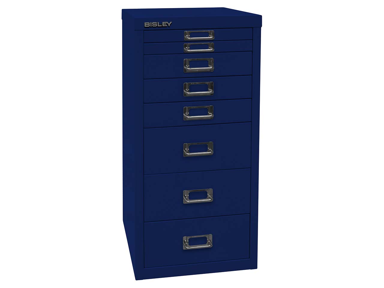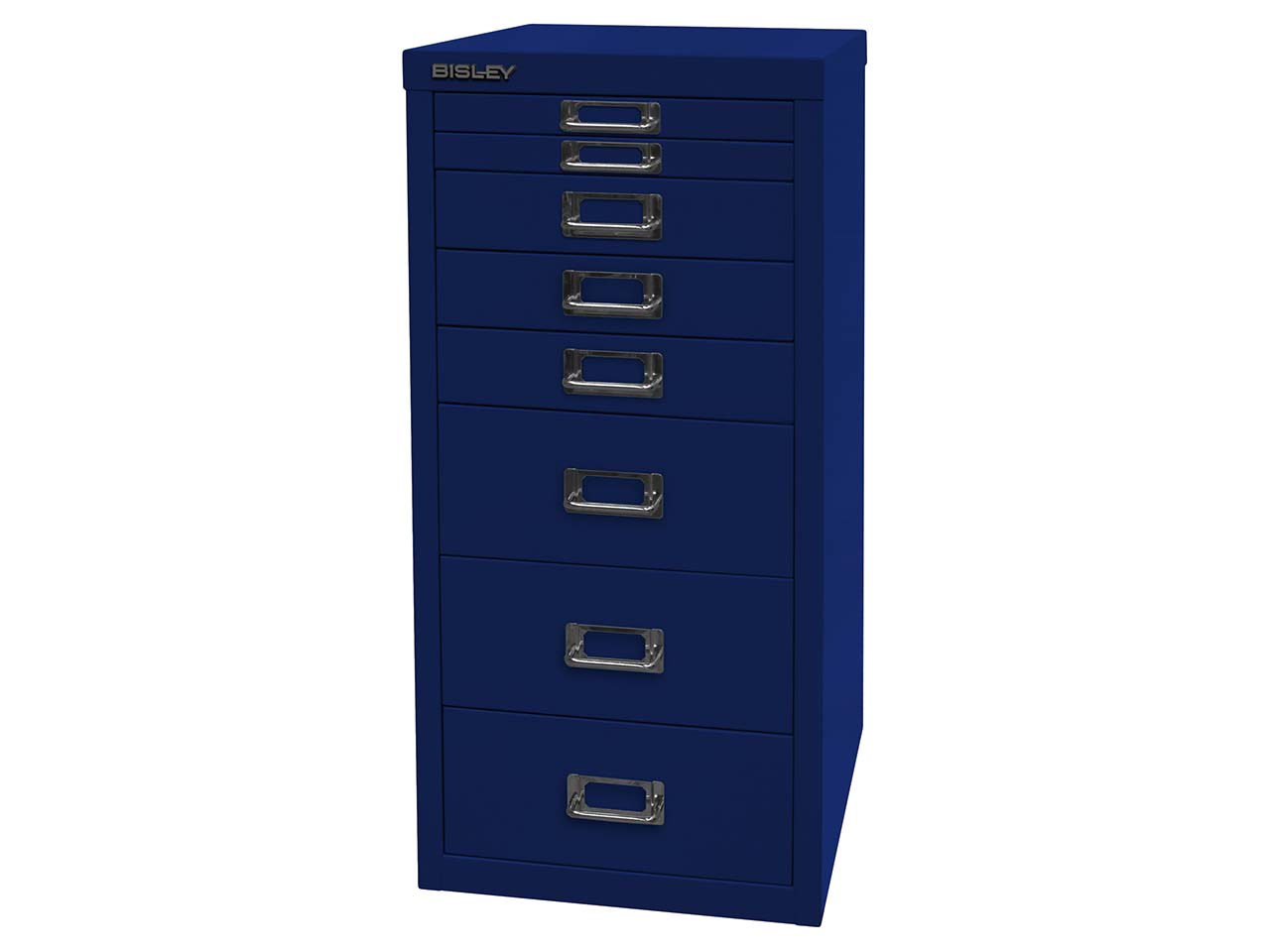 Mit dem BISLEY Schubladenschrank bleiben Sie in Sachen Ordnung flexibel. Der Metallschrank hat 8 Schubladen, die sich durch individuelle Höhen auszeichnen. An den Griffen befinden sich Etikettenfenster. Höhe der Schubladen: 2 x 2,5 cm, 3 x 5,1 cm, 3 x 10,2 cm. Für Format DIN A4 geeignet. B 27,8 x T 38 x H 59 cm. Farbe blau.