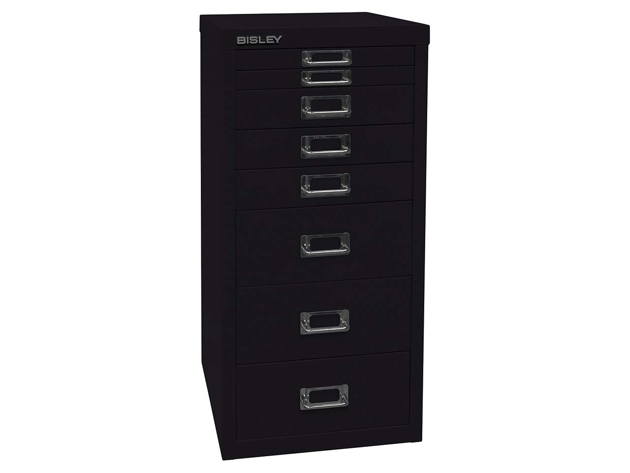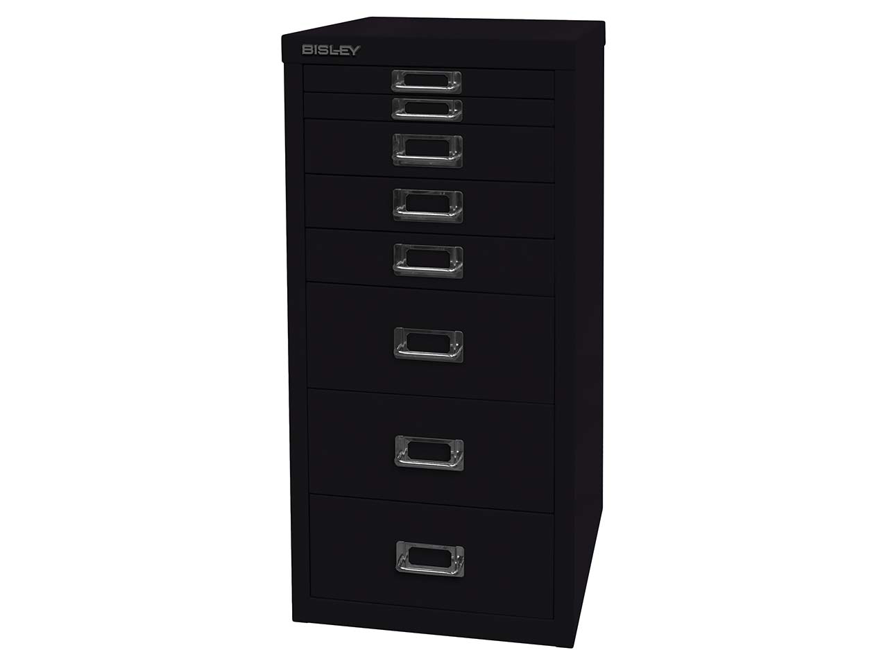 Mit dem BISLEY Schubladenschrank bleiben Sie in Sachen Ordnung flexibel. Der Metallschrank hat 8 Schubladen, die sich durch individuelle Höhen auszeichnen. An den Griffen befinden sich Etikettenfenster. Höhe der Schubladen: 2 x 2,5 cm, 3 x 5,1 cm, 3 x 10,2 cm. Für Format DIN A4 geeignet. B 27,8 x T 38 x H 59 cm. Farbe schwarz.
