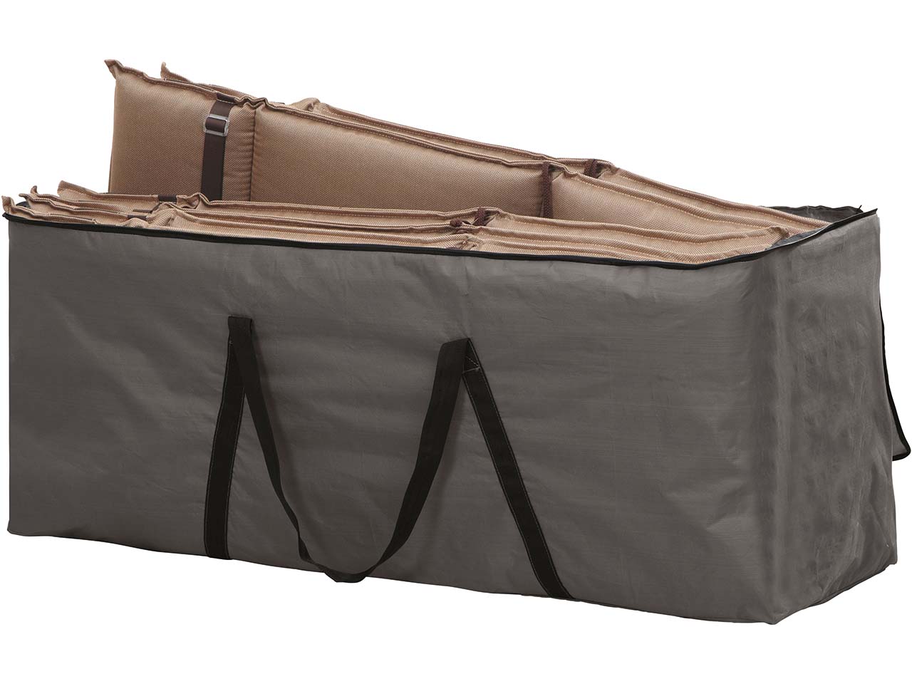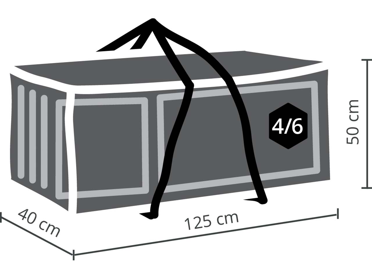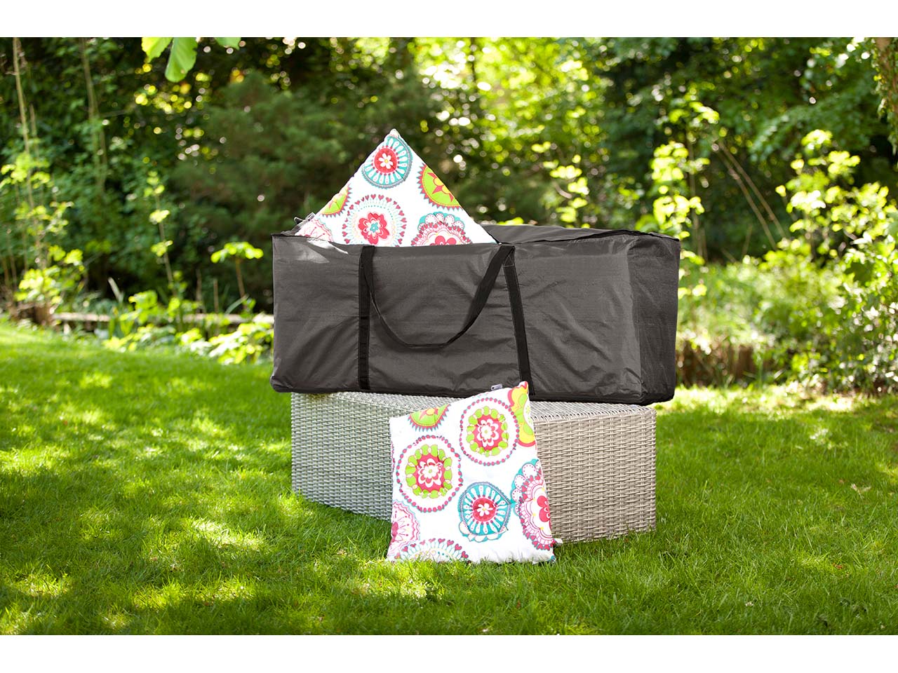 In dieser Schutzhülle aus Polyestergewebe mit wetterfester Beschichtung bleiben Kissen trocken. Die Aufbewahrungstasche mit seitlichen Tragegriffen macht den Transport kinderleicht.