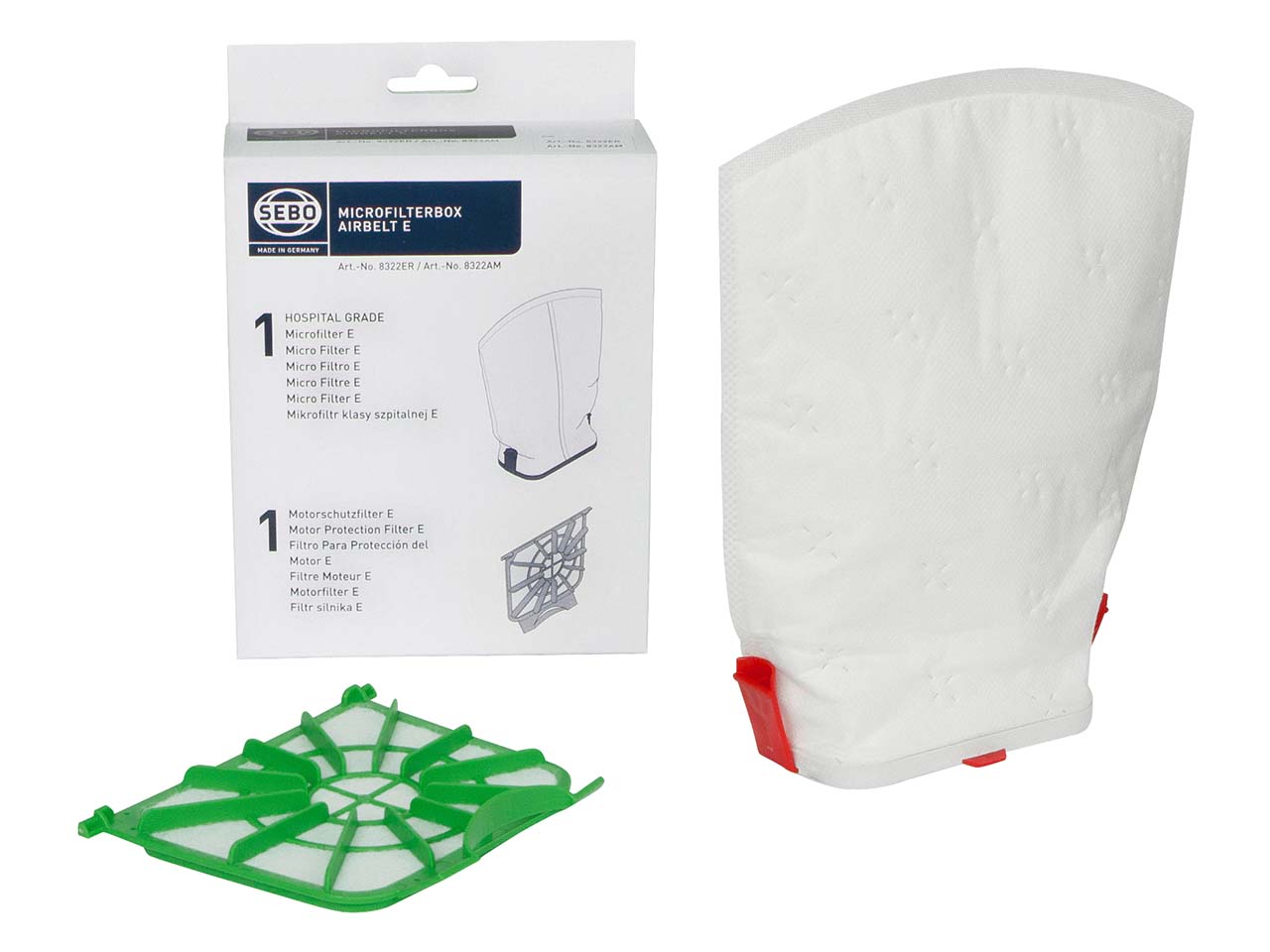 Das Set besteht aus einem Allergiker- und einem Motorfilter für SEBO Staubsauger der E-Serie. Die Filter werden nach ca. 16 verbrauchten Tüten gewechselt.