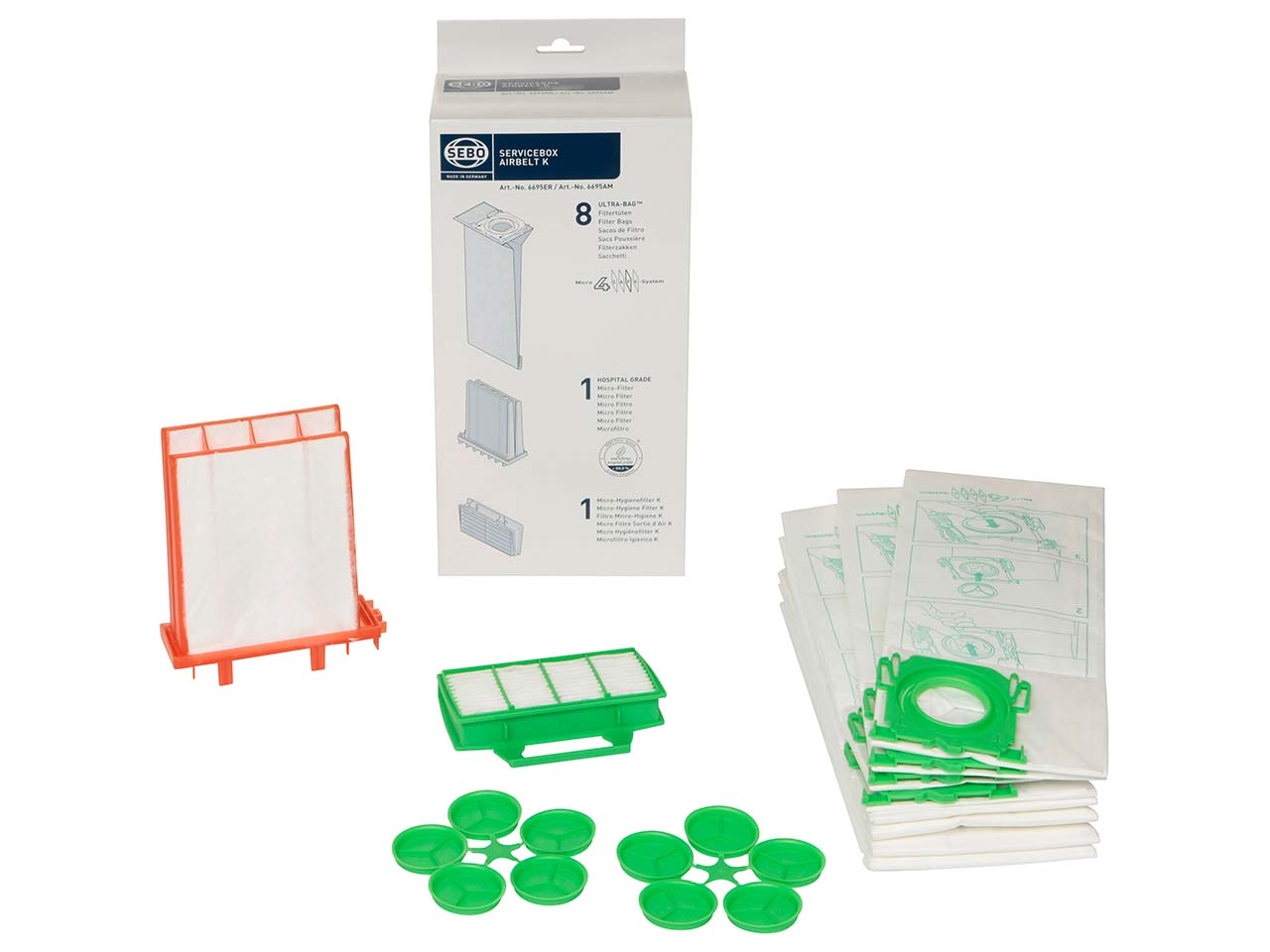 Die SEBO Servicebox ist speziell für die Nutzung mit Modellen der Airbelt K-Serie entwickelt. Die umfangreiche Box beinhaltet 8 Filtertüten, einen Motorfilter sowie einen Allergikerfilter.
