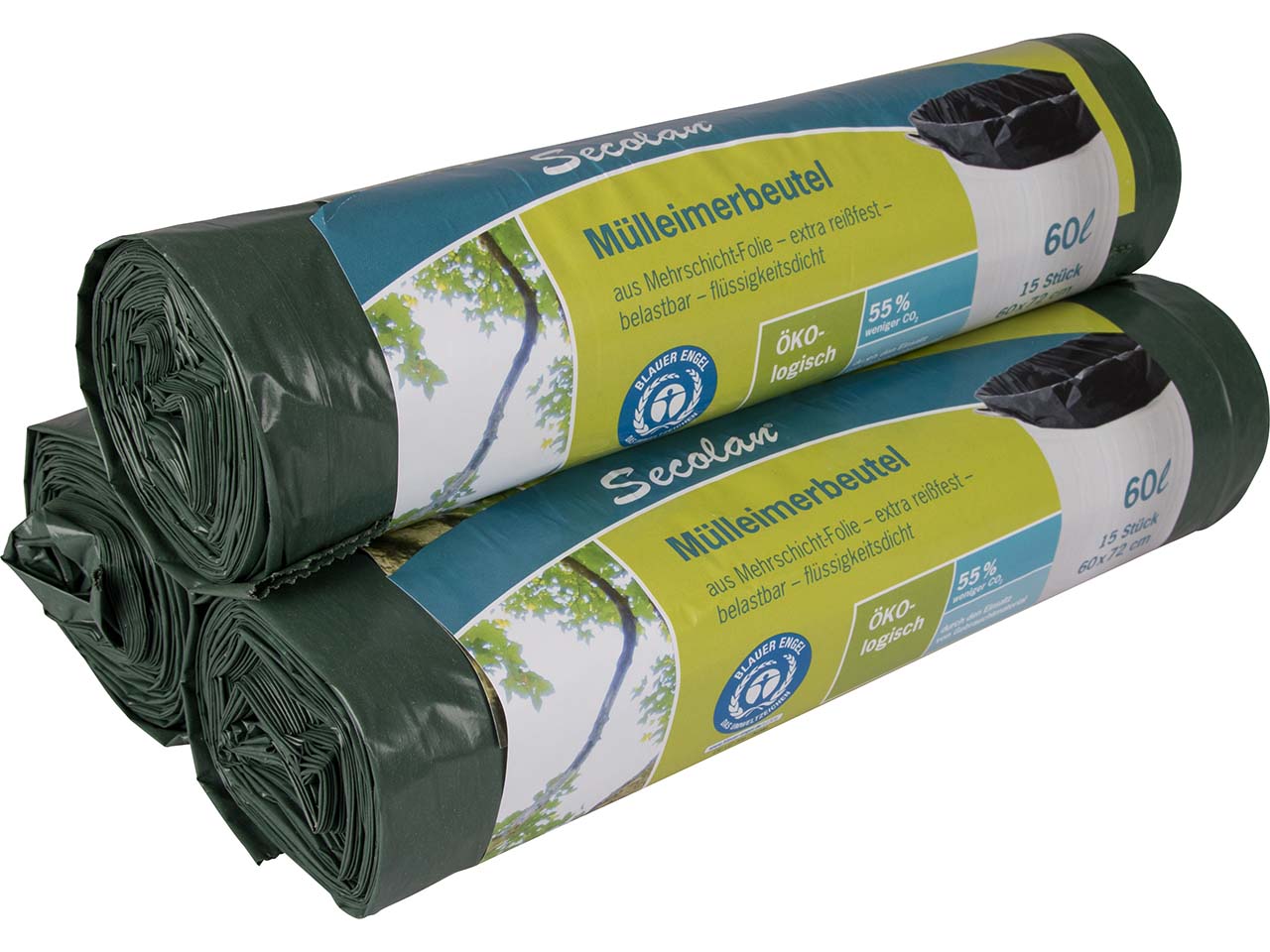 Diese Müllbeutel sind aus 100 % recycelten Kunststoffen hergestellt und dafür mit dem Blauen Engel ausgezeichnet. Sie sind sehr reißfest, belastbar und flüssigkeitsdicht. Mülleimerbeutel ohne Zugband. B 60 x H 72 cm, 60 l. 1 Pack = 15 Stk. Farbe grün/schwarz.