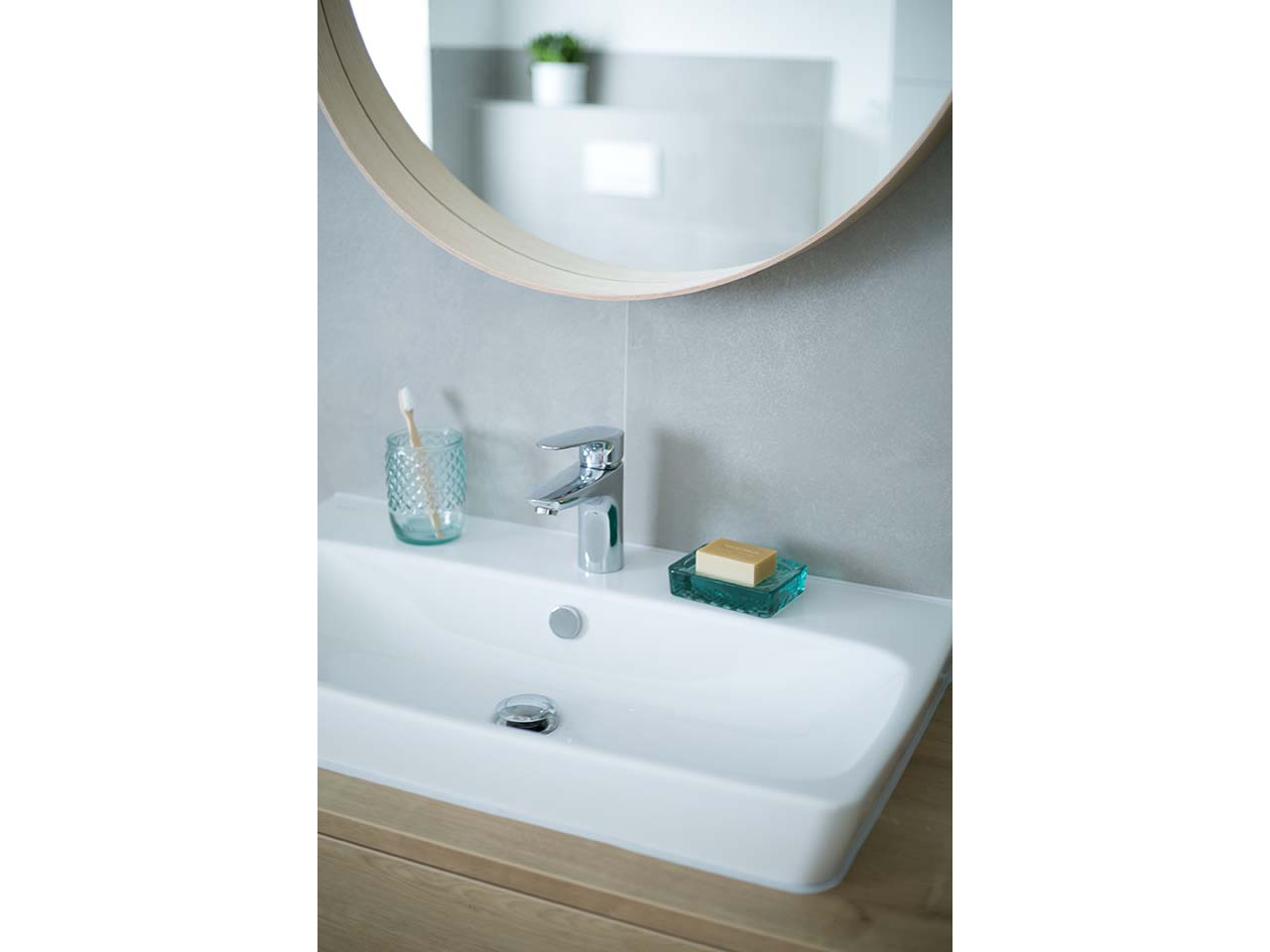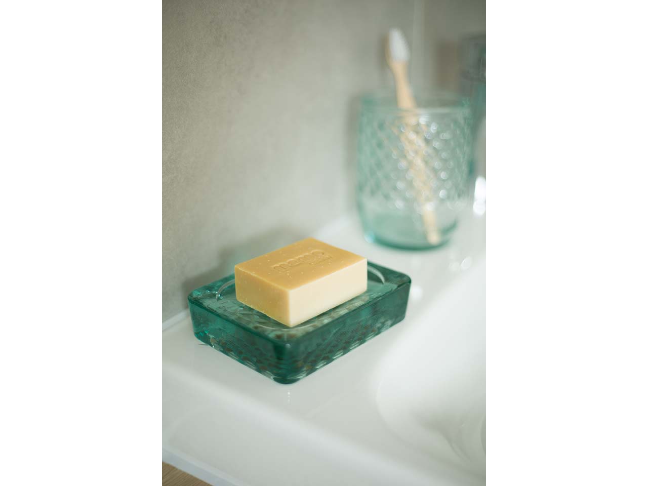 Durch die Verwendung von Recyclingglas werden wertvolle Rohstoffe geschont und Energie bei der Herstellung eingespart. Die Seifenschale stammt von einem führenden spanischen Hersteller mit langjähriger Erfahrung im Altglas-Recycling.
