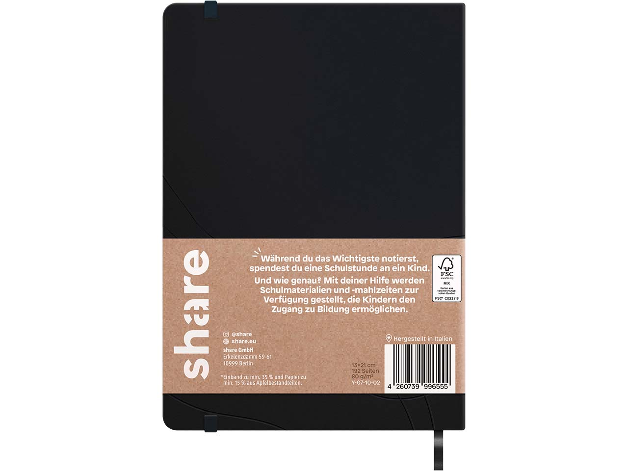 In diesem kleinen, handlichen blanko Notizbuch ist viel Platz für Gedanken, Skizzen, Notizen oder Zeichnungen. Doch das ist nicht alles, was dieses Büchlein so besonders macht: Das cremeweiße Papier besteht zu mindestens 15 % und das Hardcover in Lederoptik zu mindestens 35 % aus Apfelbestandteilen! Ein Lesefaden und das elastische Verschlussband machen das DIN-A5-Notizbuch alltagstauglich. 16 Seiten sind perforiert und lassen sich bei Bedarf einfach herausreißen. Einen sozialen Impact hat das handliche Journal für unterwegs auch: Als Teil des share-Schreibwarensortiments spendet der Kauf des Notizbuches einem Kind in Uganda eine Schulstunde!