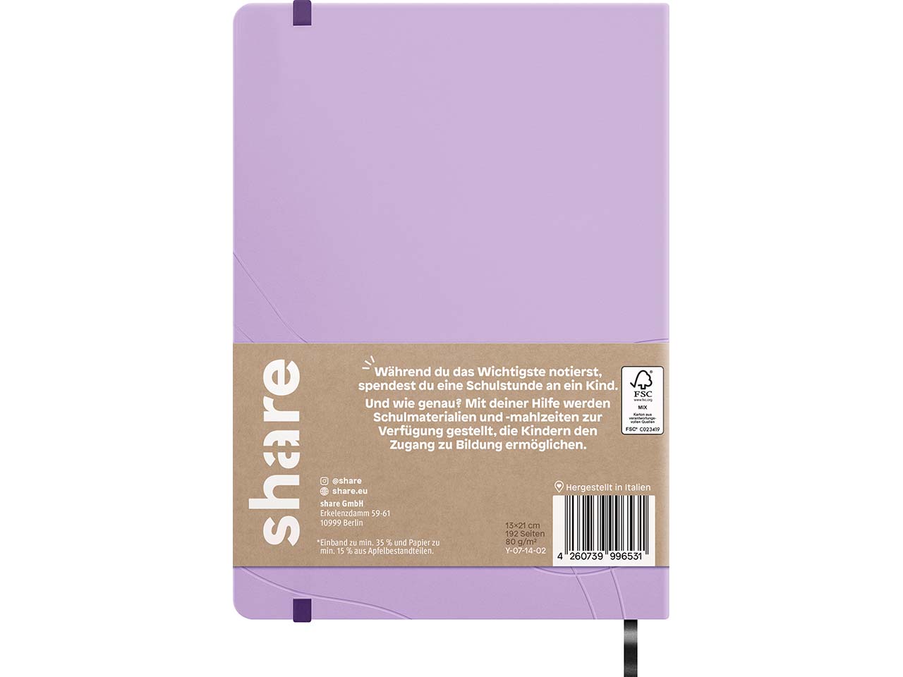 Hier ist viel Platz, um Gedanken festzuhalten, Zeichnungen zu Papier zu bringen, Bullet Journaling zu betreiben oder sich anders kreativ auszuleben: Das DIN-A5-Notizbuch bereichert den Alltag – und nicht nur den eigenen. Als Teil des share-Schreibwarensortiments spendet der Kauf des Notizbuches einem Kind in Uganda eine Schulstunde! Die Nachhaltigkeit kommt dabei nicht zu kurz: Papier und das Soft-Cover in Lederoptik enthalten zu mindestens 35 % Apfelbestandteile. Das macht das Notizbuch zu etwas ganz Besonderem. Auf dem cremeweißen Papier lässt sich angenehm schreiben. 32 der 192 Blätter sind perforiert und können so leicht ausgerissen werden. Ein Lesefaden und das elastische Verschlussband vereinfachen die tägliche Organisation.