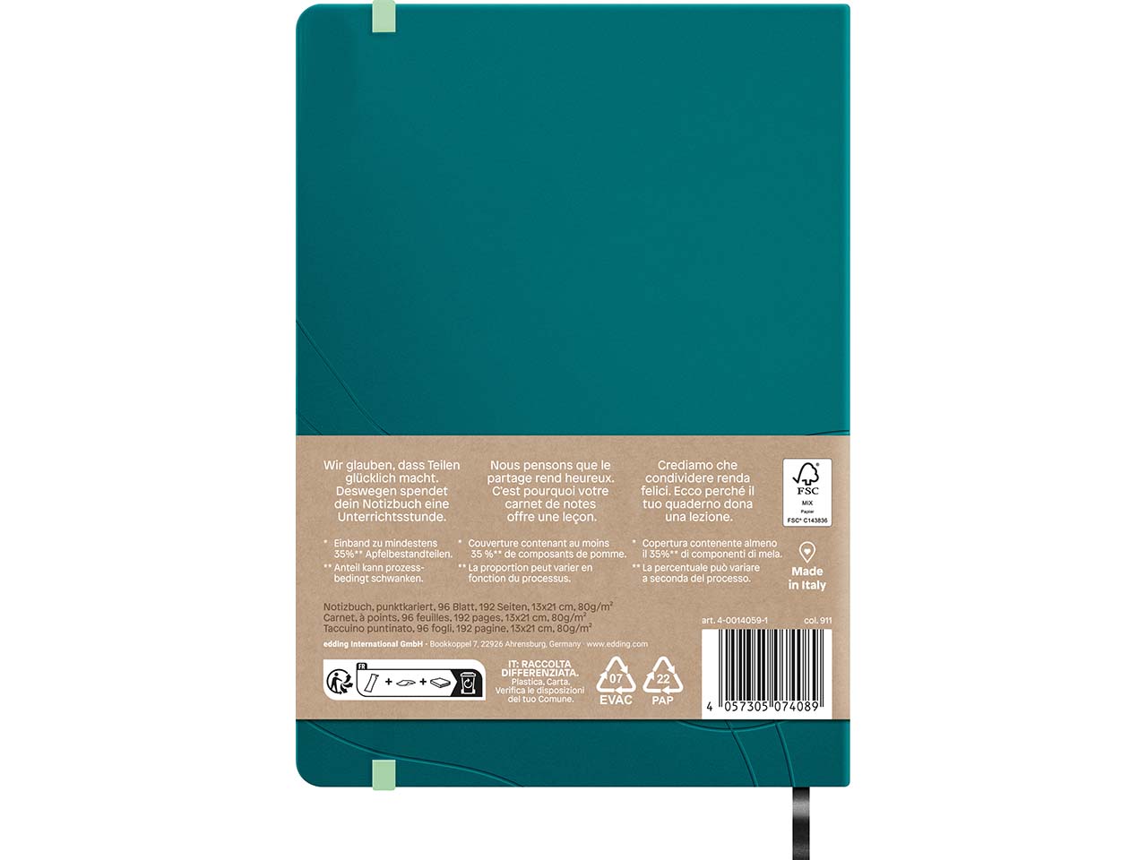 - Soft-Cover und Papier aus mindestens 35 % Apfelbestandteilen