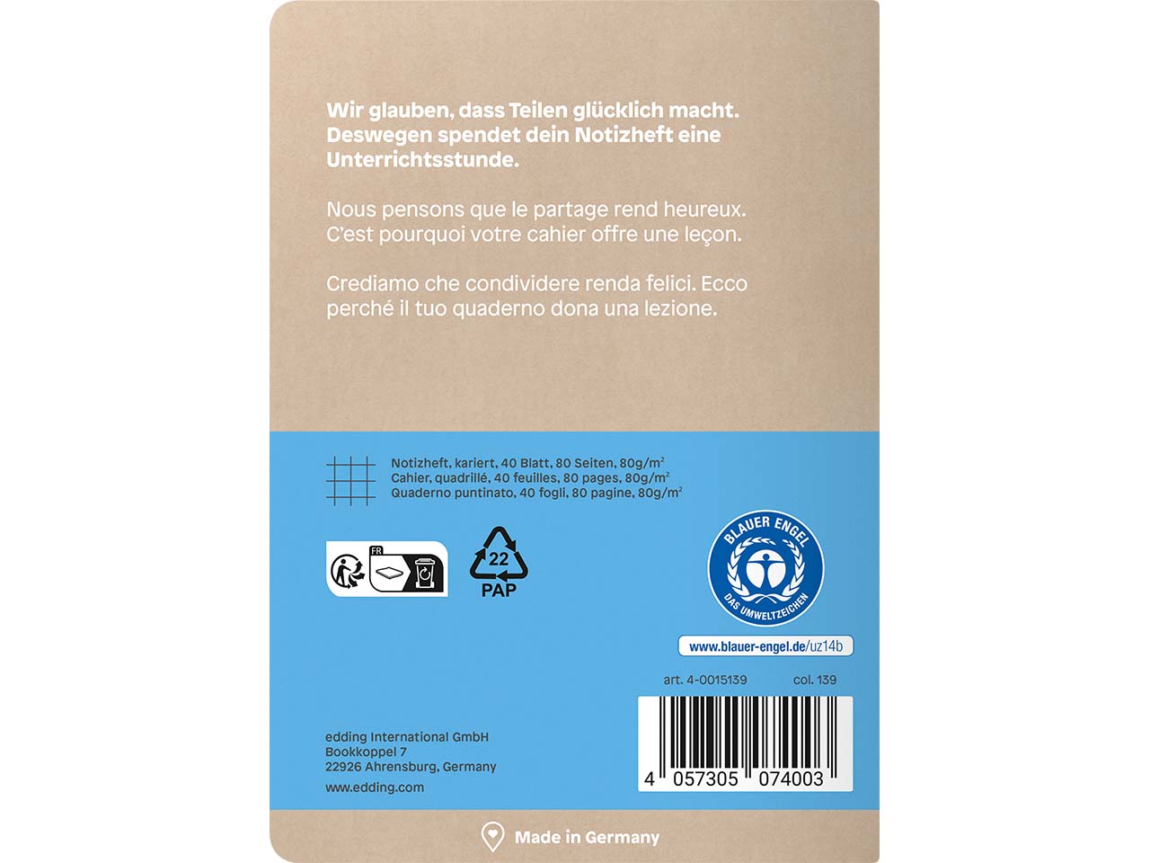 Festhalten, was wichtig ist: Das vielseitig nutzbare DIN-A6-Notizheft ist dafür perfekt geeignet. Es findet Einsatz in der Schule, im Büro oder auch Zuhause. Das Notizheft enthält 40 Seiten Recyclingpapier und ist mit dem Blauen Engel ausgezeichnet. Doch es punktet nicht nur mit umweltverträglicher Herstellung: Es gehört zum share-Schreibwarensortiment, das mit dem Erlös aus dem Verkauf soziale Projekte unterstützt. So spendet der Kauf des Notizhefts einem Kind eine Schulstunde in Uganda! Die abgerundeten Ecken ermöglichen eine komfortable Handhabung des Notizhefts.
