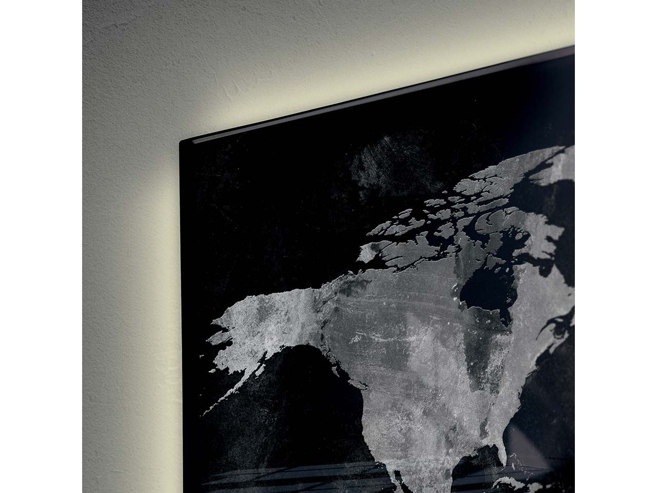 Die Glas-Magnettafel mit Weltkartenmotiv ist für ihr Design mehrfach prämiert. Dabei kommen Funktionalität und Qualität nicht zu kurz: Die wie vor der Wand schwebende Oberfläche besteht aus Tampered Glas bzw. ESG-Sicherheitsglas. Sie ist magnethaftend, beschreib- und abwischbar. Die warmweiße LED-Beleuchtung ist fest verbaut und stellt sicher, dass angeheftete Notizen, Visitenkarten, Einkaufszettel, etc. gut sichtbar sind.