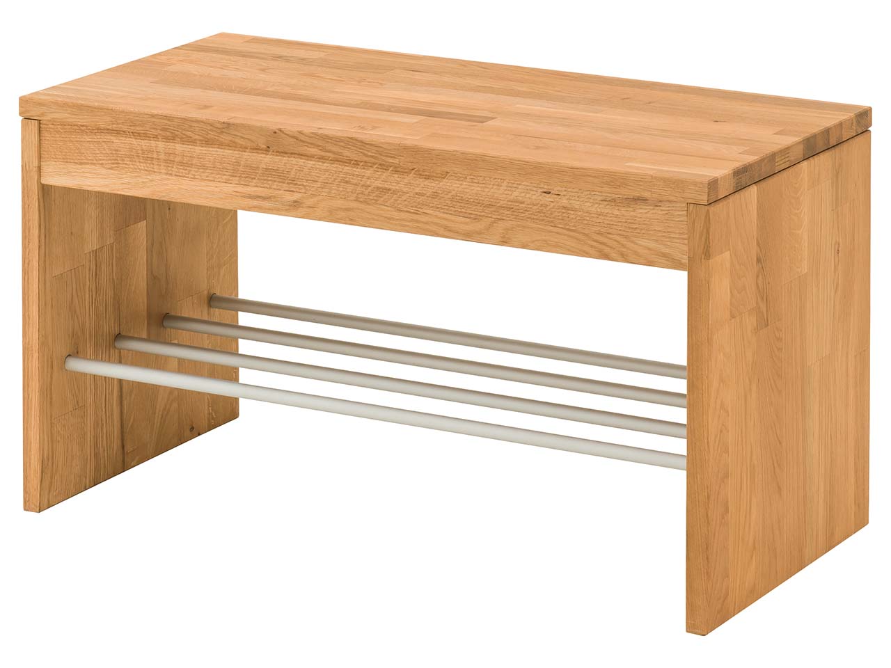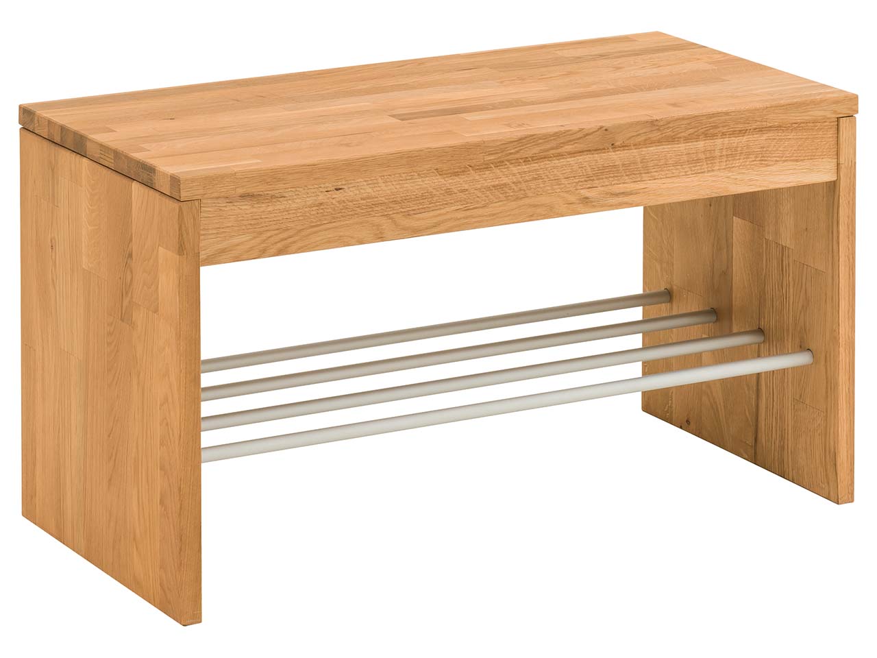 Stilvolles, geradliniges Design für Ihren Eingangsbereich in Wohnung oder Haus: Die Sitzbank "Comma" aus massiver Wildeiche überzeugt mit ihrer hochwertigen, stabilen Qualität. Sie hat eine Schuhablage aus Alurohren, die für eine platzsparende, ordentliche Unterbringung von Schuhen sorgt. B 82 x T 40 x H 45 cm.
