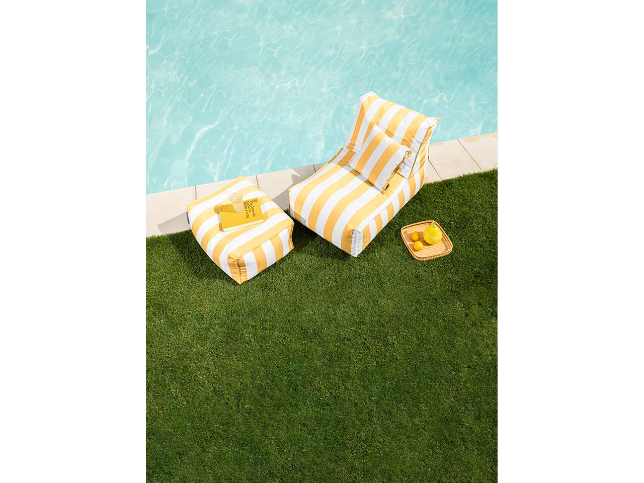 Poolliege mal anders: Dieser Sitzsack lädt dazu ein, es sich so richtig gemütlich zu machen! Der frische Streifenlook weckt das Urlaubsfeeling und der hohe Sitz- und Liegekomfort trägt dazu bei. Im Inneren befinden sich hochwertige EPS-Perlen aus deutscher Produktion, die sich dem Körper optimal anpassen. Die Rückenlehne sorgt für höchsten Komfort beim Lesen oder Relaxen. Der Bezug ist aus wasser- und schmutzabweisendem Material gefertigt und lässt sich leicht reinigen, wenn mal z.B. Eiscreme darauf tropft. B 100 x T 65 x H 65 cm.