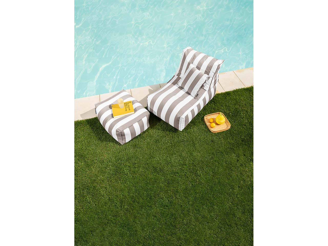 Dieser Sitzsack ist die perfekte Ergänzung für „Rock Santorin“. Hier lassen sich die Beine ablegen – oder der Sitzsack wird als eigenständiger Hocker genutzt. Er hat das gleiche sommerliche Streifendesign und punktet mit seiner gemütlichen Qualität. Diese entsteht durch die hochwertigen EPS-Perlen im Inneren. Bezogen ist der Outdoor-Sitzsack mit einem Bezug aus wasser- und schmutzabweisendem Material. Kleine Regengüsse und Ähnliches machen dem Outdoormöbel nichts aus. Ideal für Balkon, Terrasse oder Garten. B 55 x T 65 x H 35 cm.