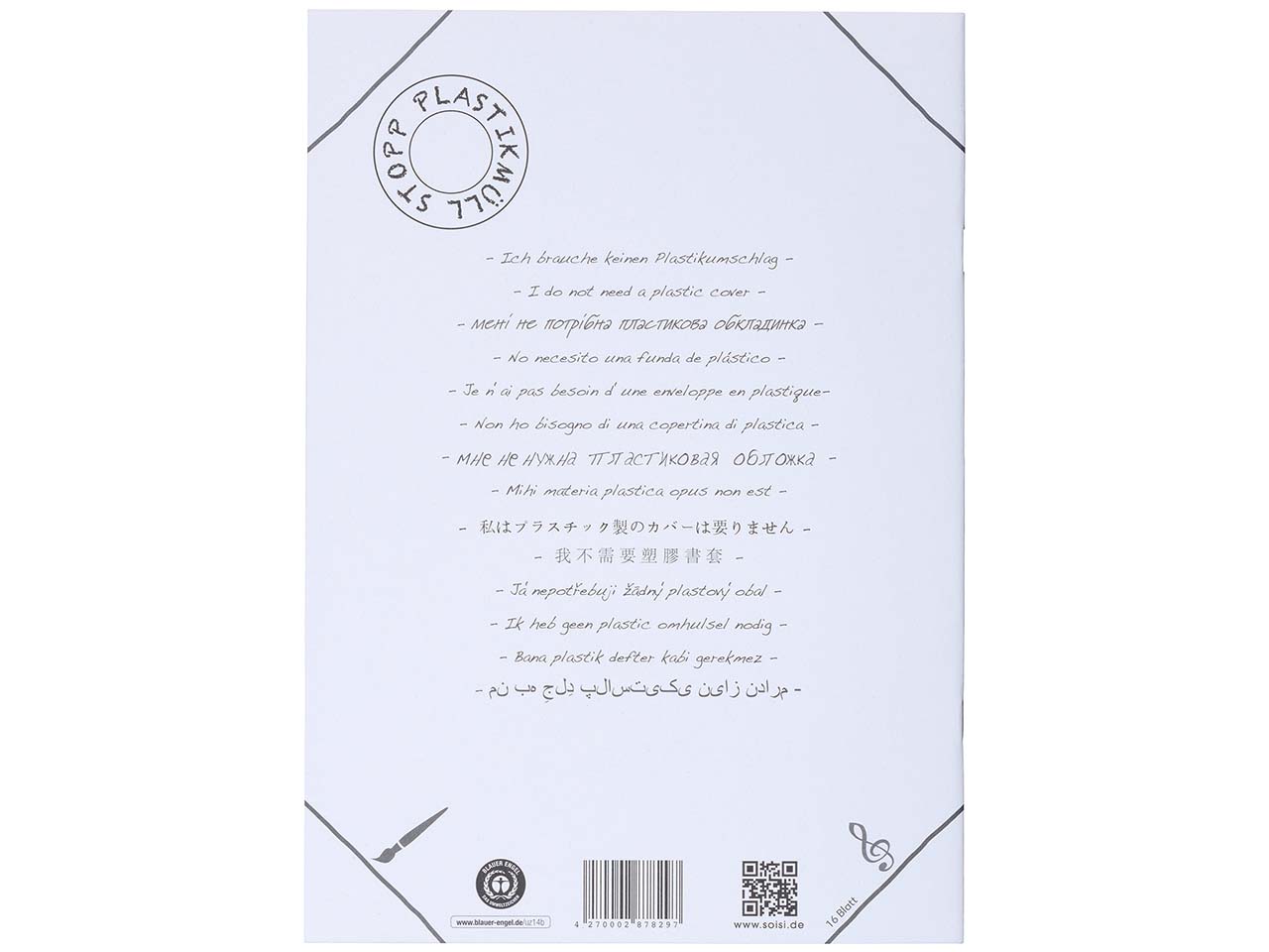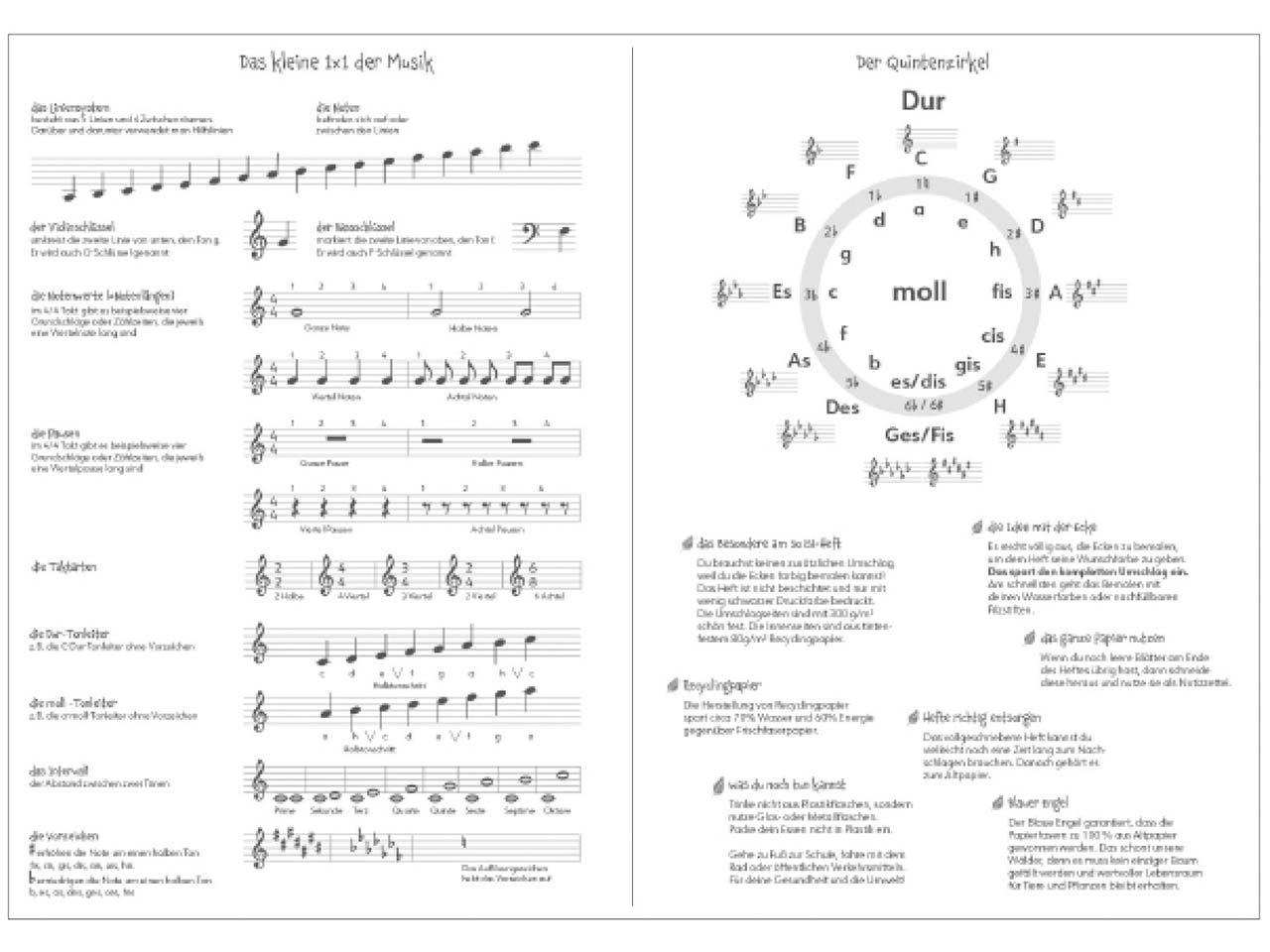 Das Notenheft (Lineatur 14) ist im Musikunterricht unverzichtbar! Dabei spart das mit dem Blauen Engel ausgezeichnete Schulheft aus hochwertigem Recyclingpapier auch Müll ein und vermeidet Plastik. Die Ecken sind extra so gestaltet, dass Kinder sie farbig ausmalen können – so ist eine Zuordnung ganz ohne Plastikumschlag möglich. Da das DIN-A4-Heft musterfrei und unbeschichtet ist, kann es vollflächig und individuell gestaltet werden. Auf der ersten Heftinnenseite befindet sich ein informativer Text zum Thema Plastikvermeidung und Umweltschutz. Der Umschlag hat eine Grammatur von 300 g/m² und ist damit perfekt für den Schulalltag.