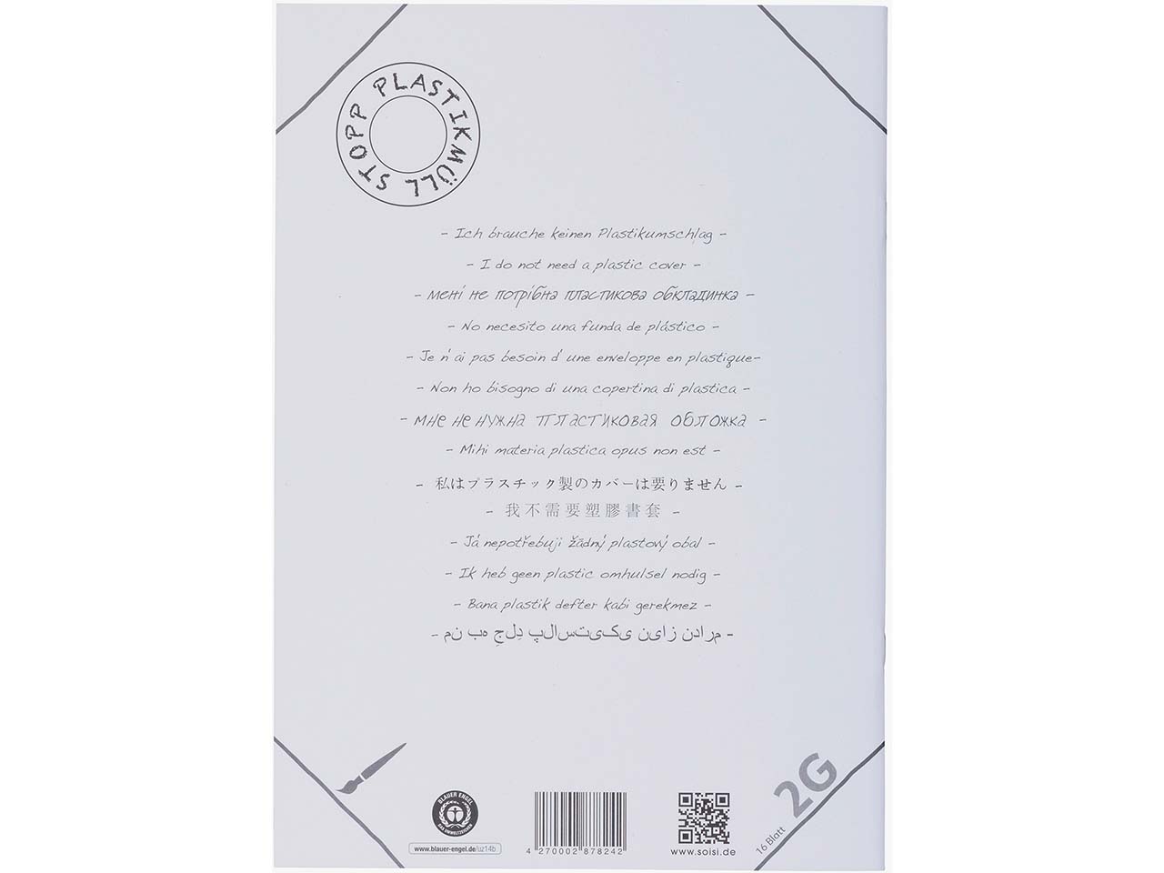 Verstärkte Grundlinien und eine Kontrastlinie helfen, die Schreibfähigkeit zu fördern. Das Schulheft Lineatur 2G ist aus Recyclingpapier hergestellt und trägt den Blauen Engel. Mit der Nutzung lässt sich der Plastikverbrauch reduzieren: Ein Umschlag wird hier nicht benötigt! Die Ecken lassen sich farbig ausmalen. Das DIN-A4-Heft ist auch frei von Mustern und einer Beschichtung, sodass es sich ganz nach eigenen Vorstellungen vollflächig gestalten lässt. Auf der ersten Heftinnenseite befindet sich ein informativer Text zum Thema Plastikvermeidung und Umweltschutz. Der Umschlag hat eine Grammatur von 300 g/m² und ist damit perfekt für den Schulalltag.