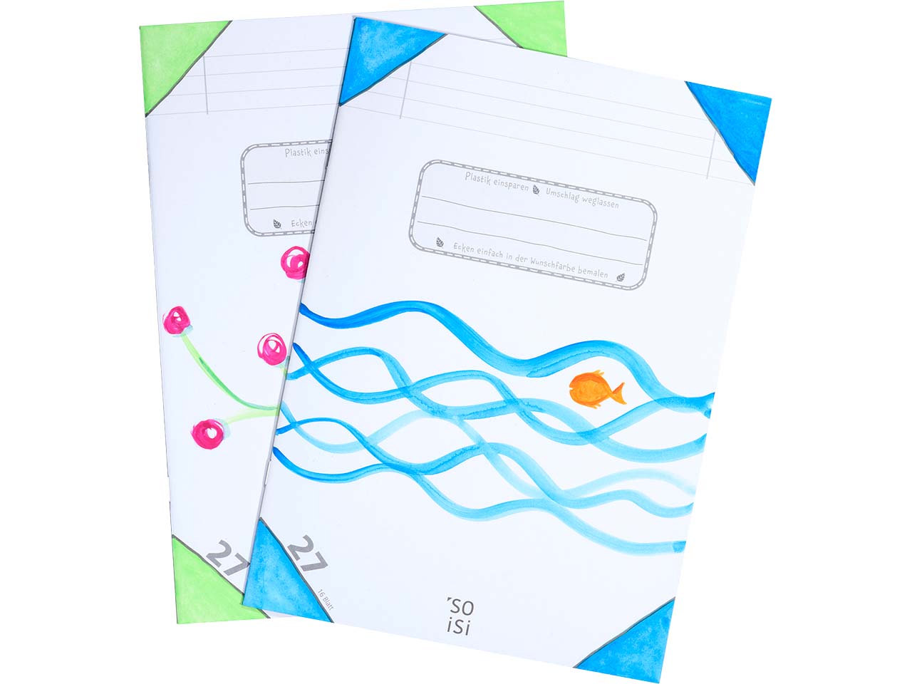 Die Schulhefte kommen vollständig ohne Plastik aus. Sie brauchen keinen zusätzlichen Umschlag, was einerseits Kunststoff einspart und andererseits Müll reduziert. Das Cover aus Karton ist ebenfalls nicht beschichtet. Die Hefte werden zudem in einer zertifizierten Umweltdruckerei gedruckt. Beim Versand und Druck wird mit in Deutschland ansässigen Familienunternehmen zusammengearbeitet.