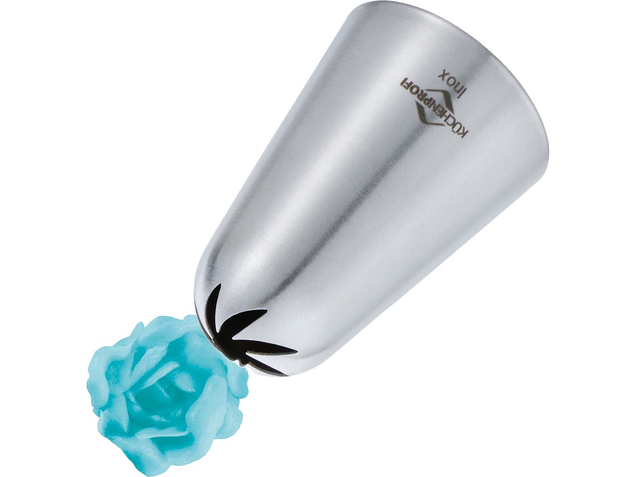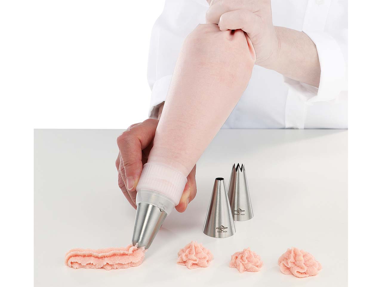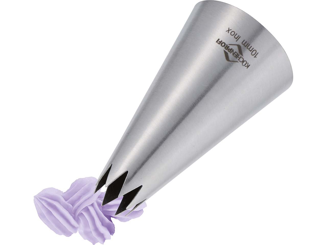 1 x Profi-Spritzbeutel mit verstärktem Rand für einfaches Befüllen, PFAS-frei 1 x Adapter für leichtes Wechseln der Tülle 3 x Tüllen: Loch 7 mm, Stern 10 mm, Rosette 1 x Reinigungsbürste |
