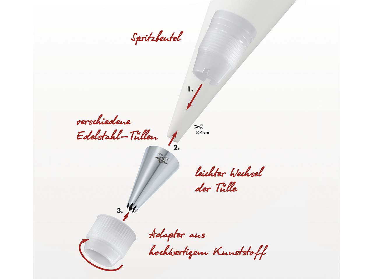 - Mit 3 Tüllen und Reinigungsbürste